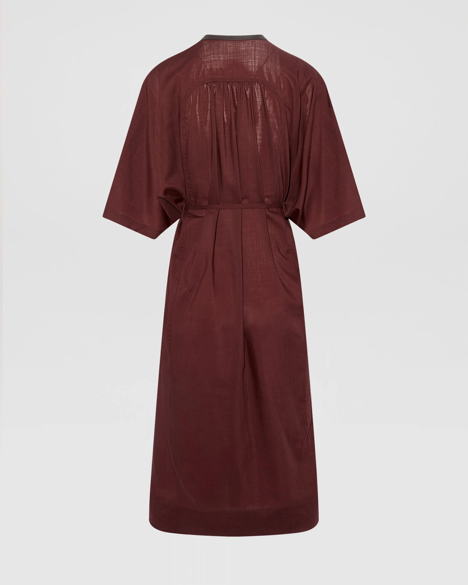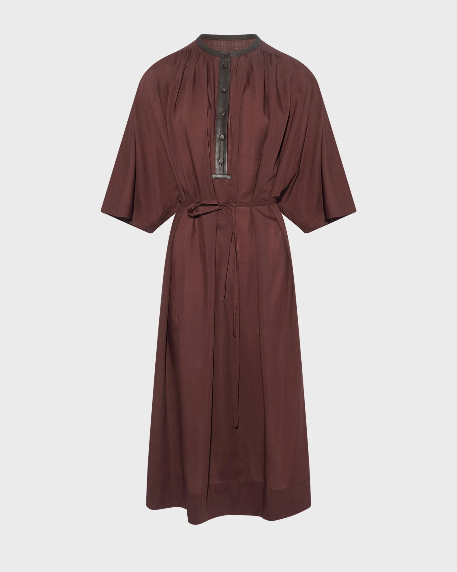 Une robe kaftan oversized, dans une voile de laine à la fois légère et chaleureuse, qui joue les contrastes de matière avec des finitions en cuir d’agneau. Forme ample à porter superposée, ceinturée ou non, selon les envies.