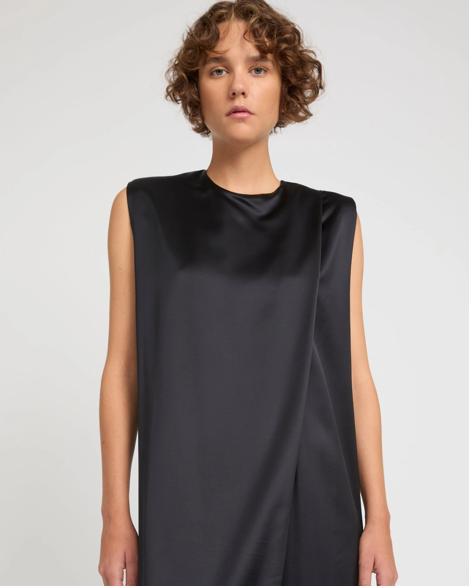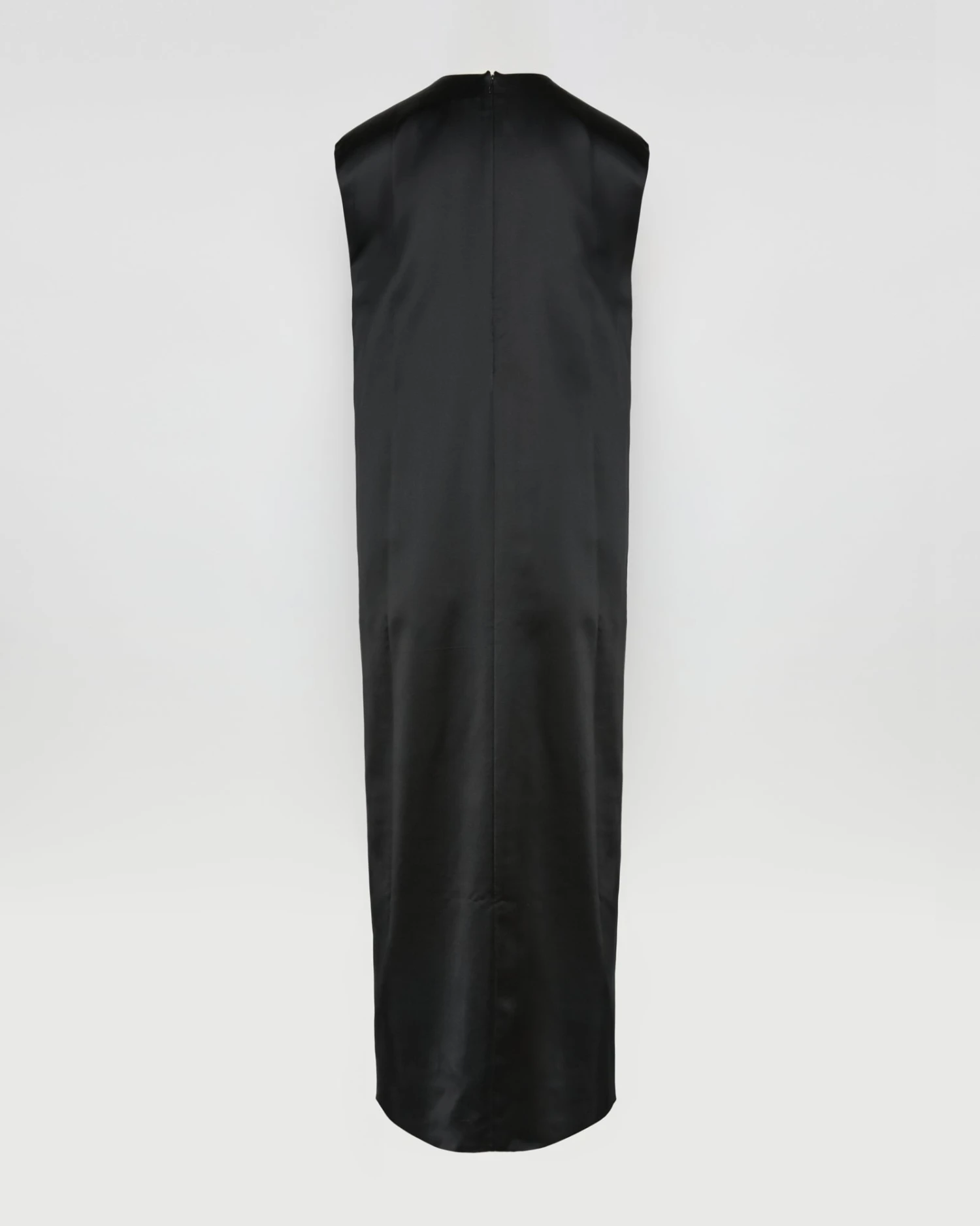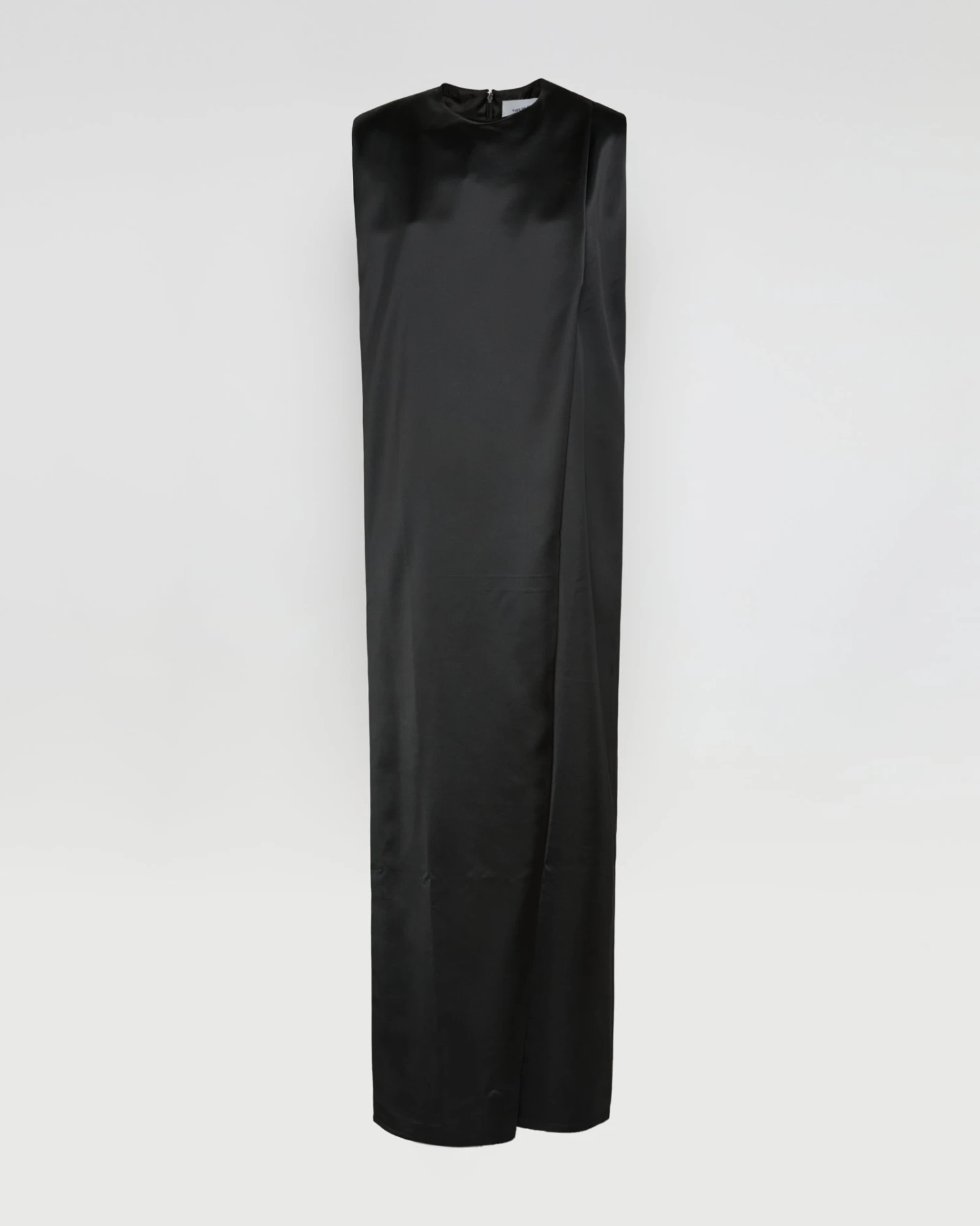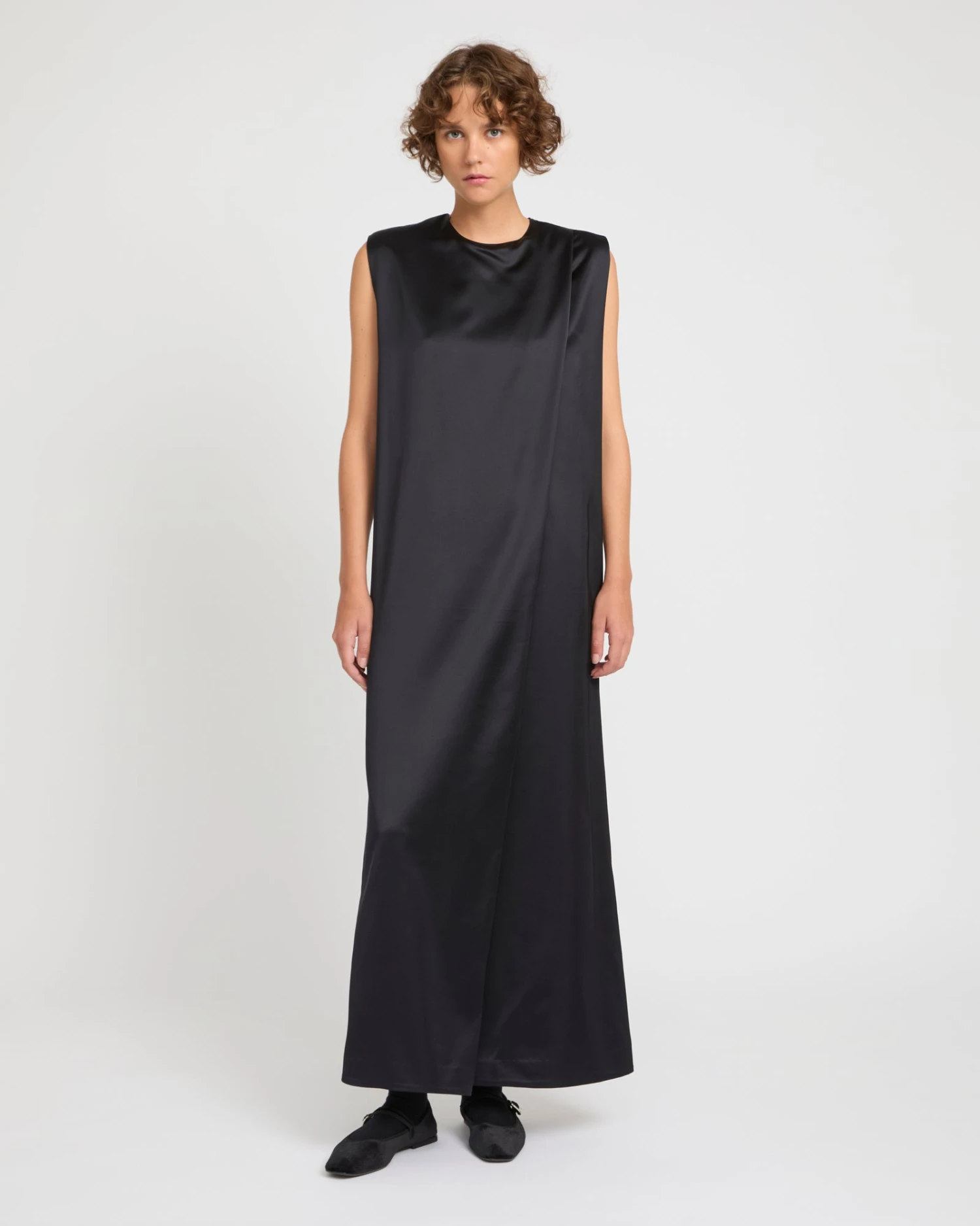 La simplicité presque monacale d’une longue robe avec un pli asymétrique à l’avant, souligné par le tombé impeccable d’un satin lourd de laine élégant et lumineux. À porter seule ou en superposition.