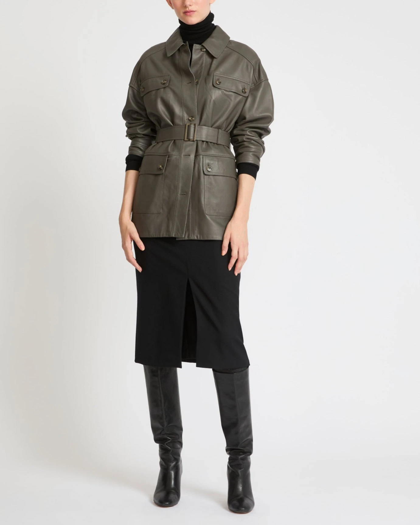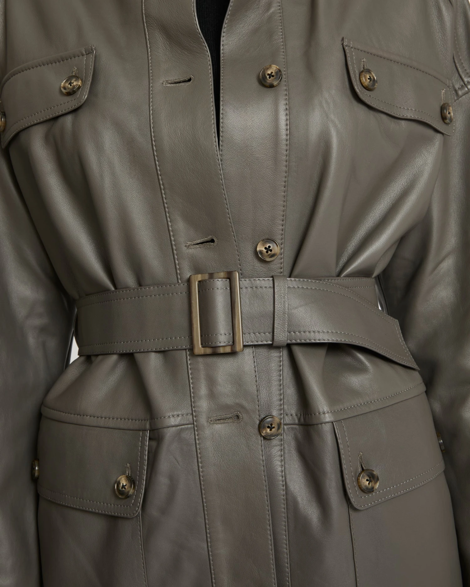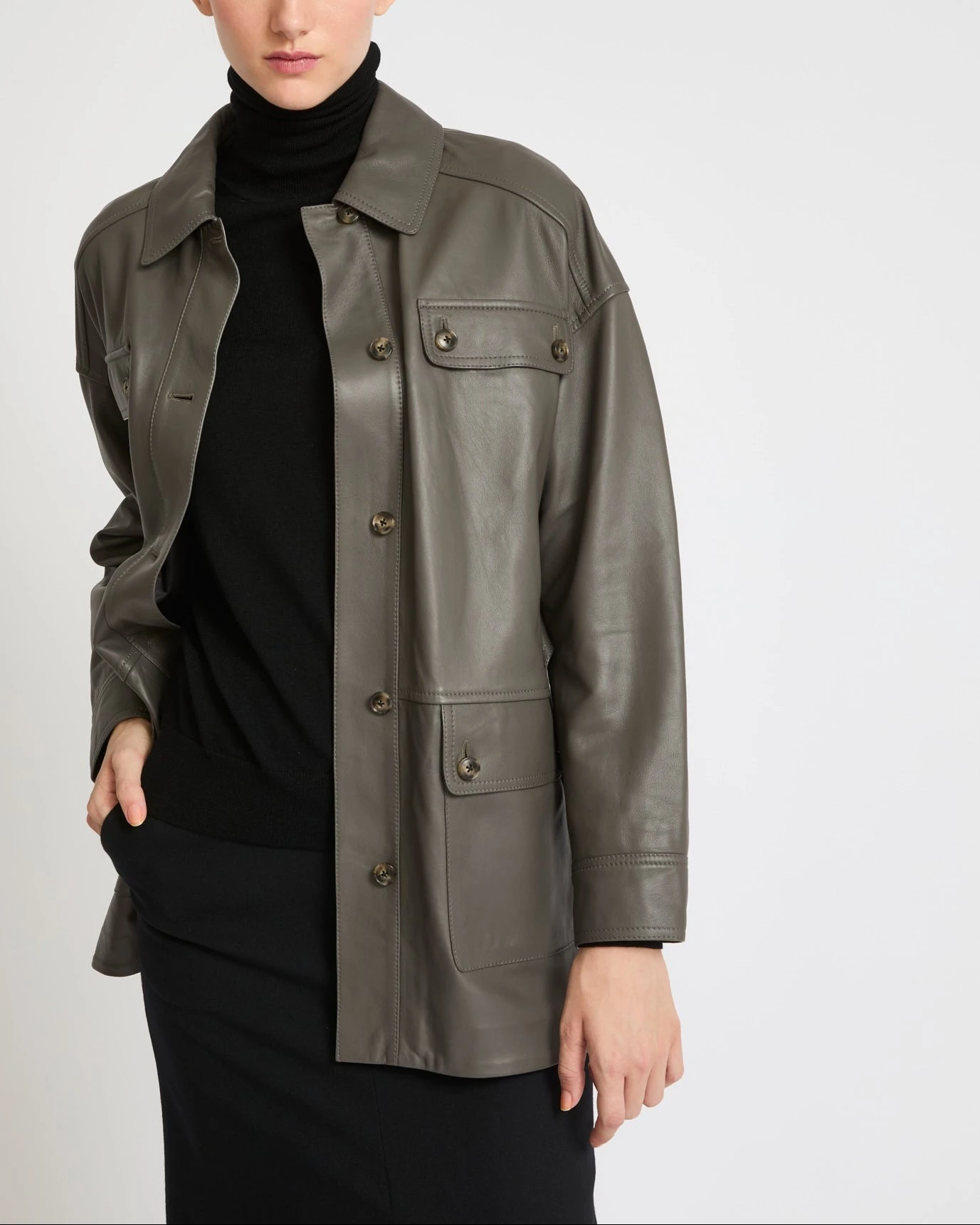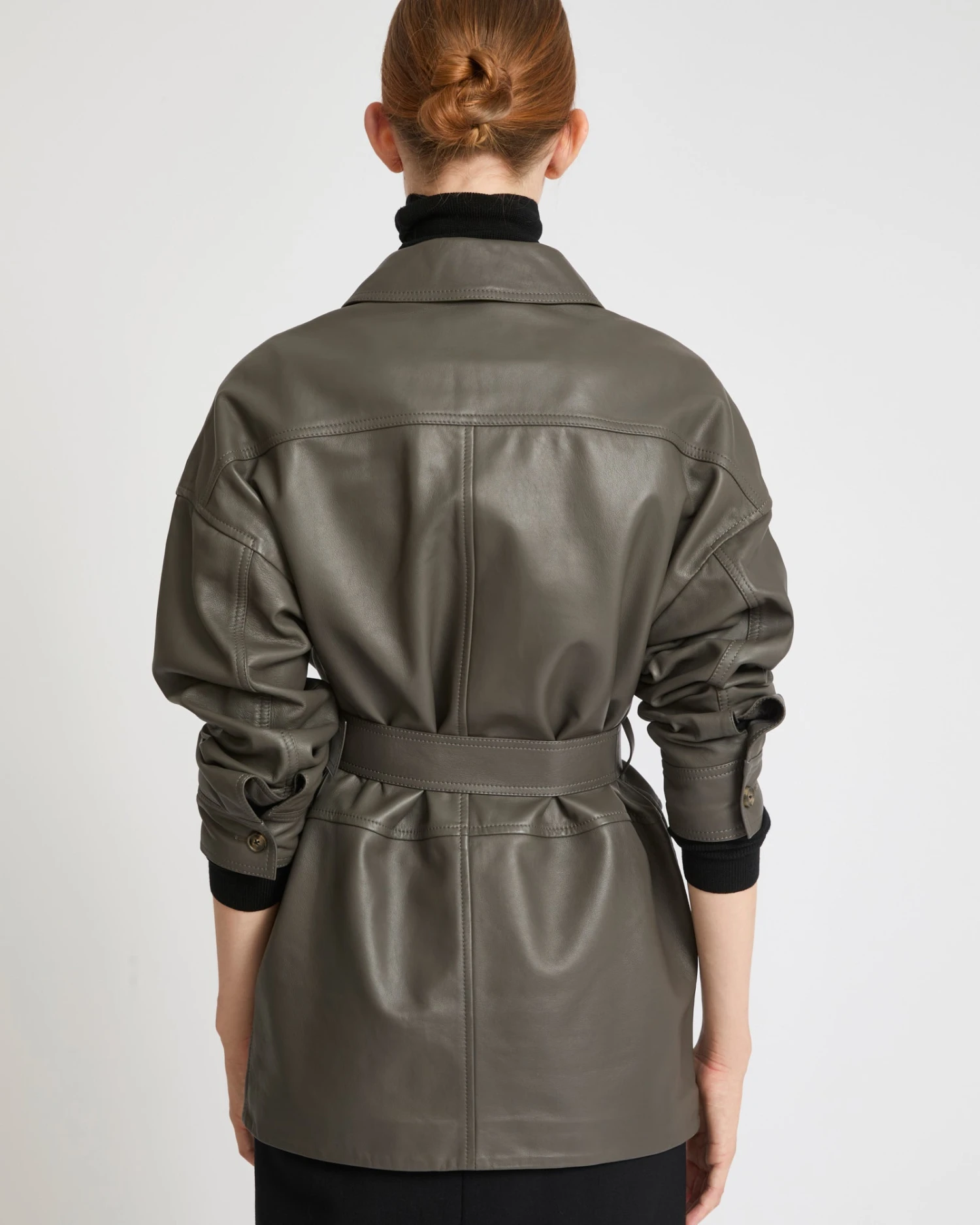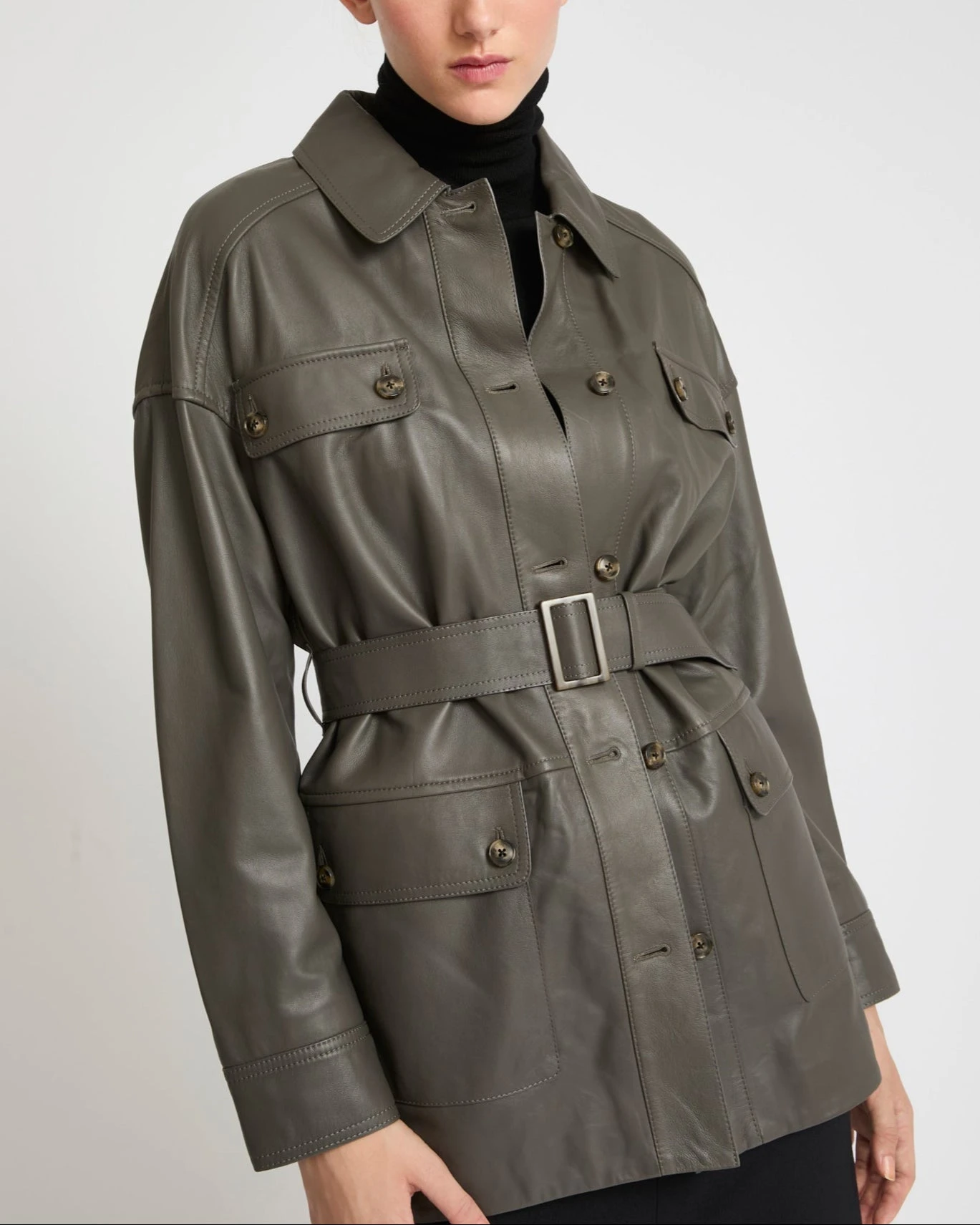 Les lignes classiques et les détails phares de la veste saharienne, poches plaquées à la poitrine, fermeture à boutons – travaillés dans un cuir d’agneau lisse avec une belle tenue. La veste peut se porter ceinturée pour mettre en valeur la taille