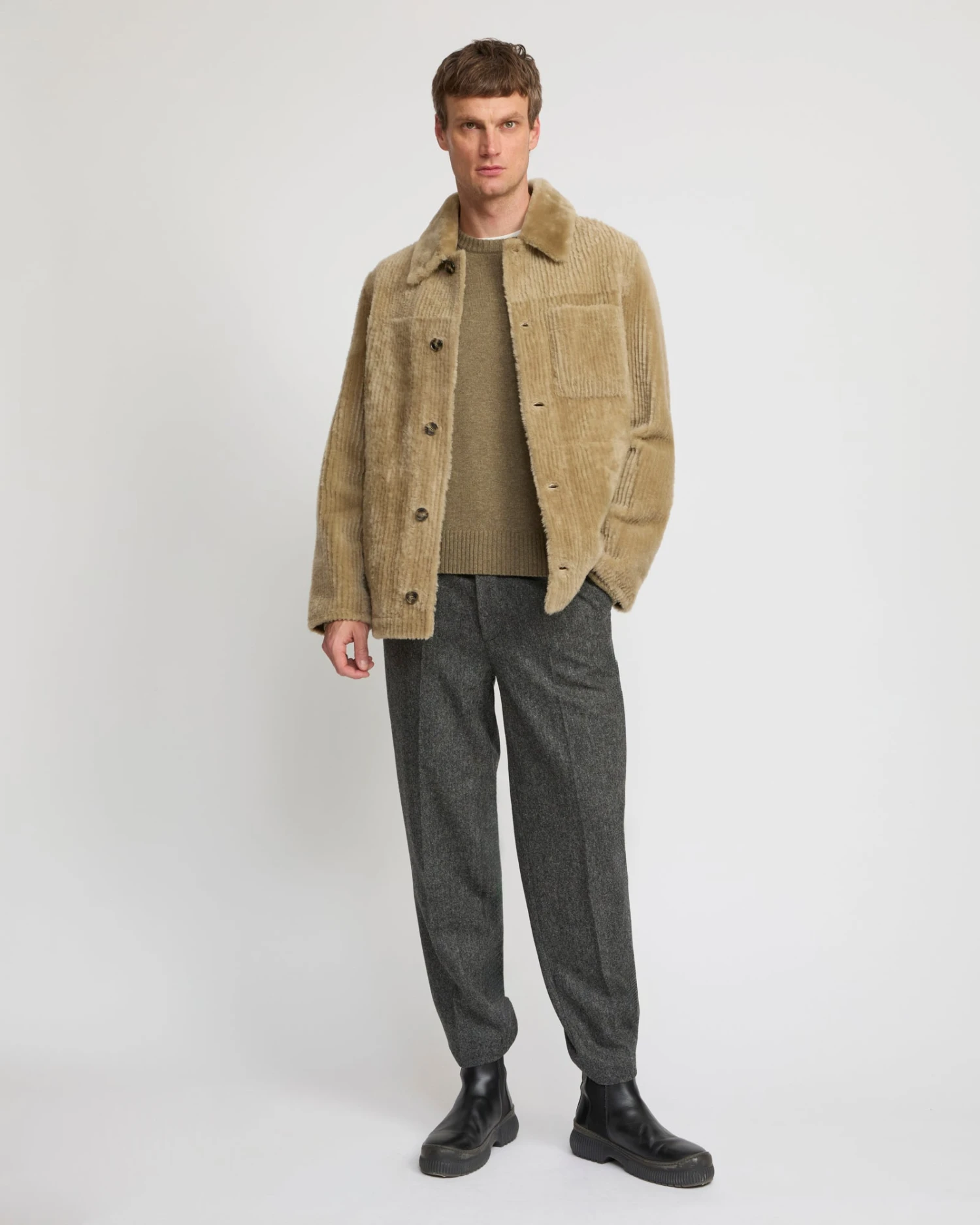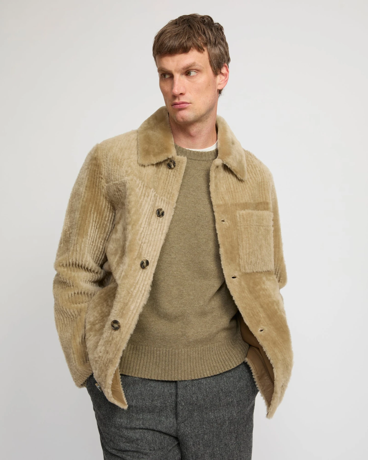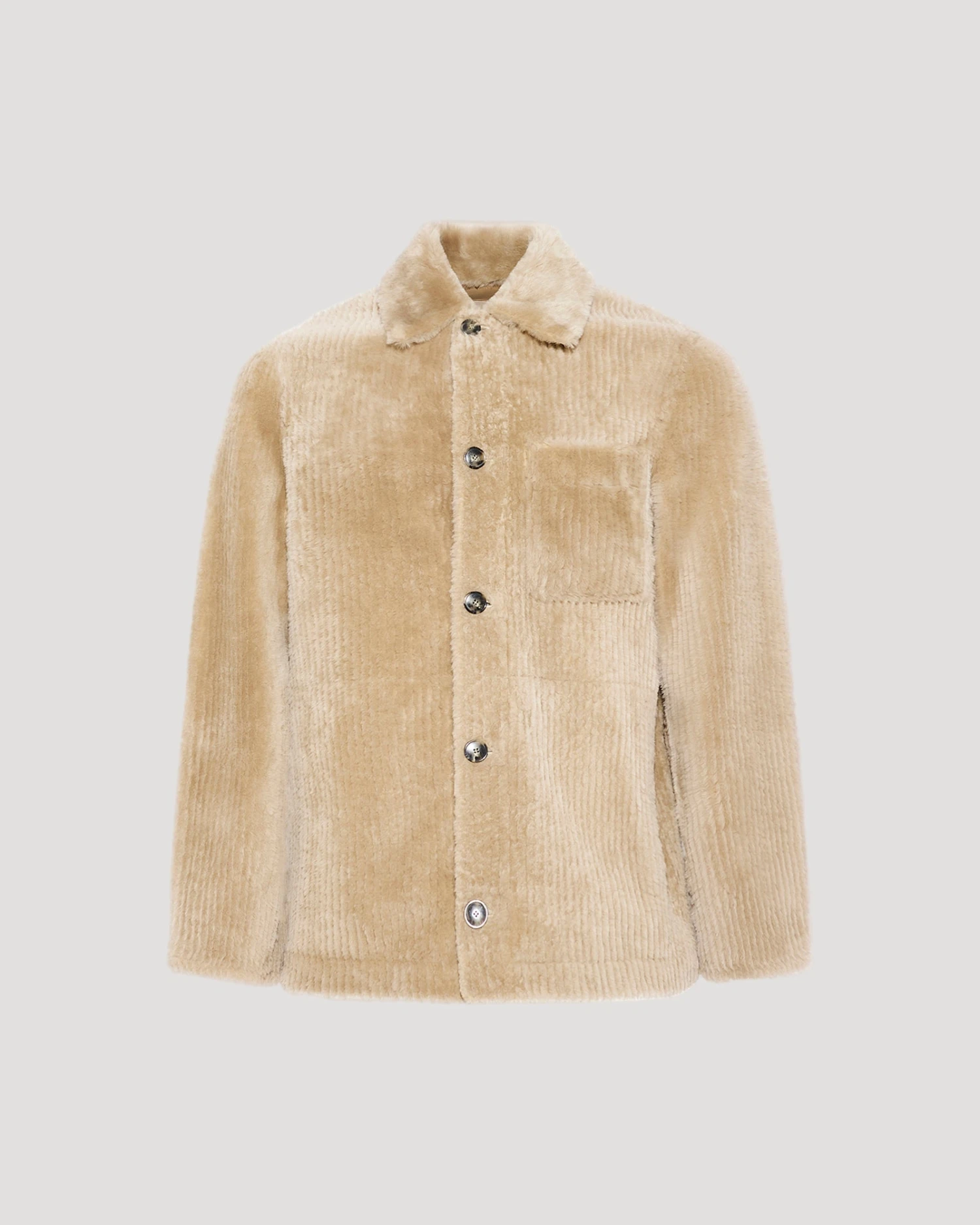 Une forme surchemise ample pour cette veste en peau lainée Mérinos, travaillée avec un effet côtelé texturé sur la face extérieure.