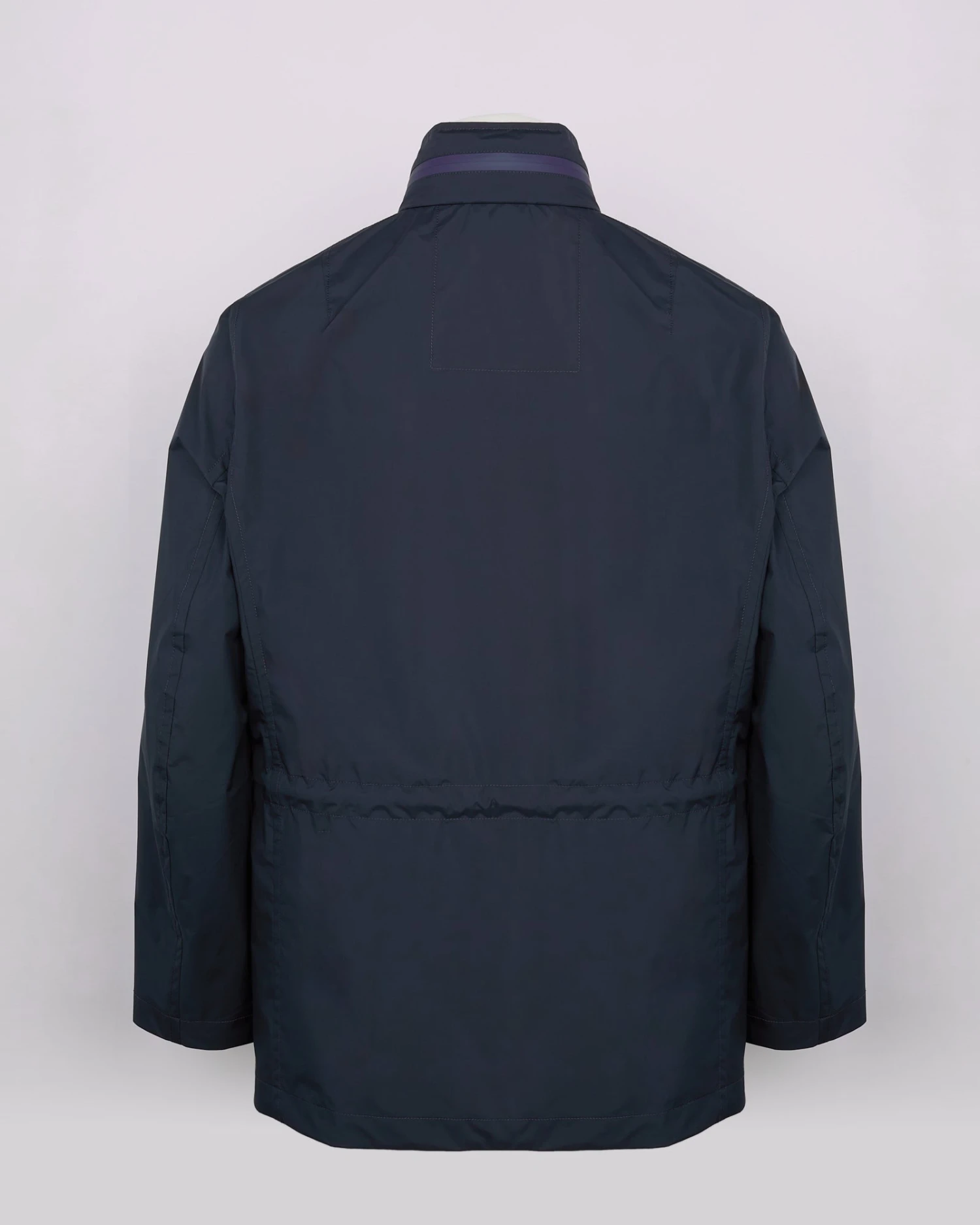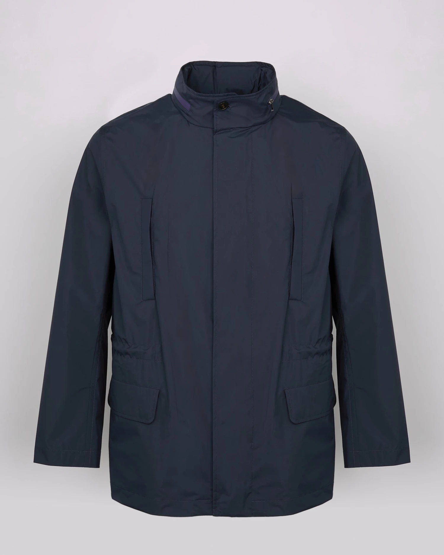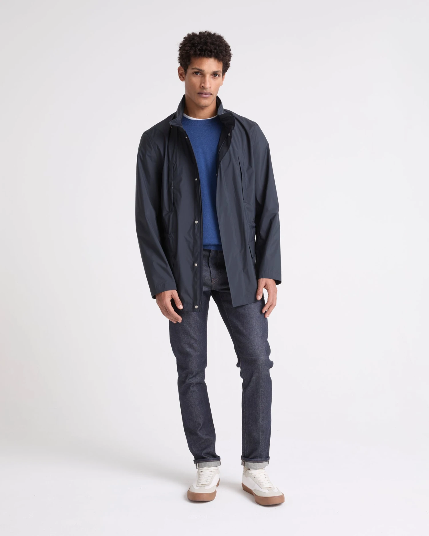 Versatile et élégante, cet hybride de la surchemise et du blouson estival est travaillé en tissu technique pour faire face aux intempéries. Une capuche se glisse dans un compartiment zippée du col. Poches zippées et à rabats à l’avant.