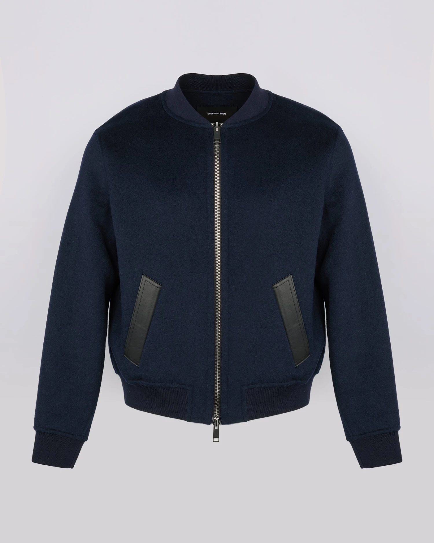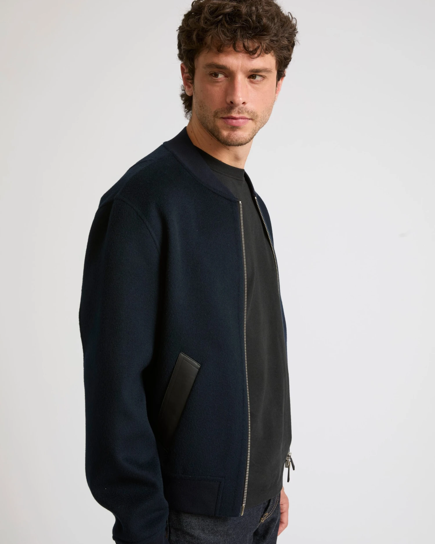 Forme teddy classique et matières luxueuses pour cette veste en mélange laine et cachemire double-face, avec des détails en cuir travaillé de manière artisanale.