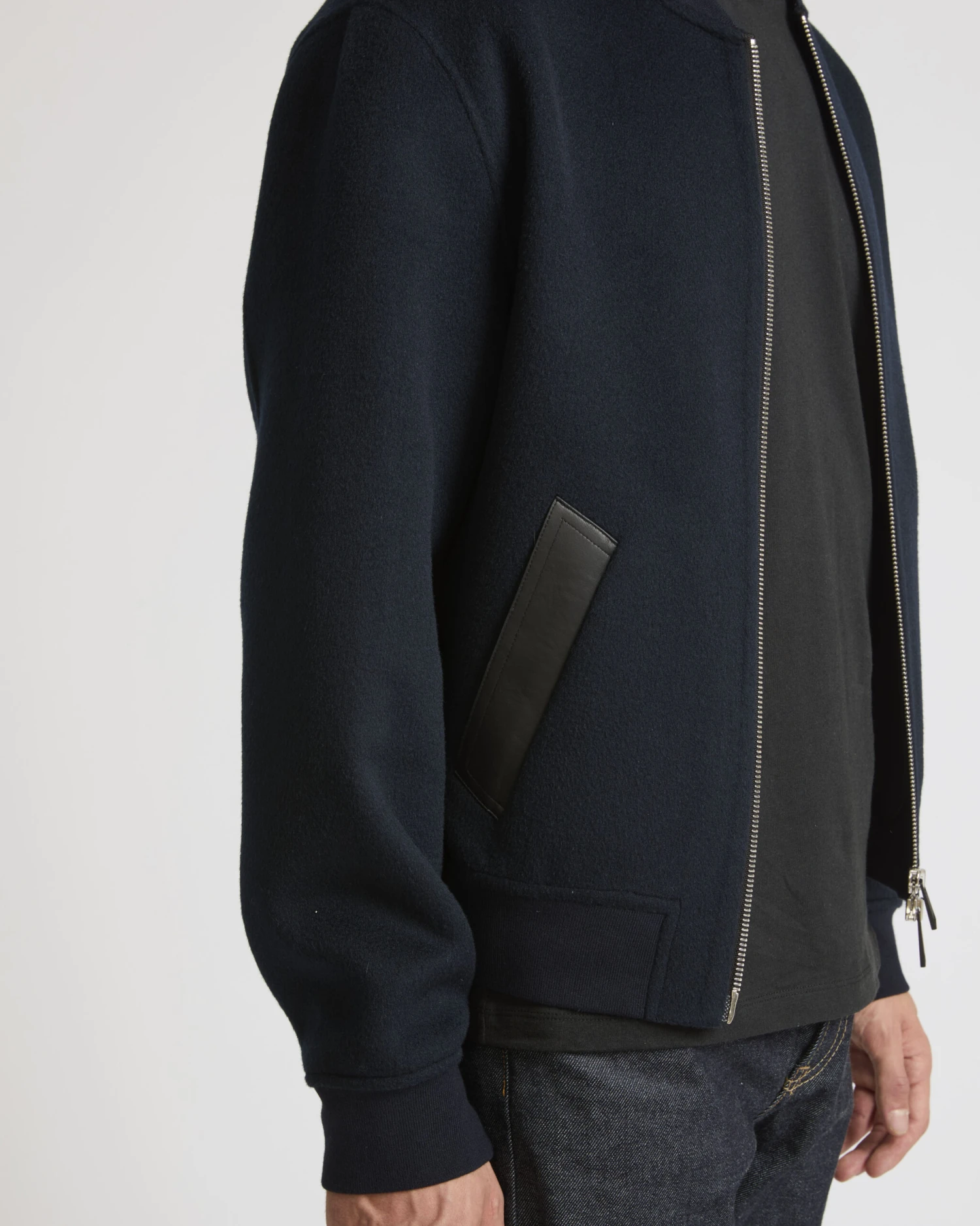 – Détails lèvres de protection zip et poches passepoilées en cuir