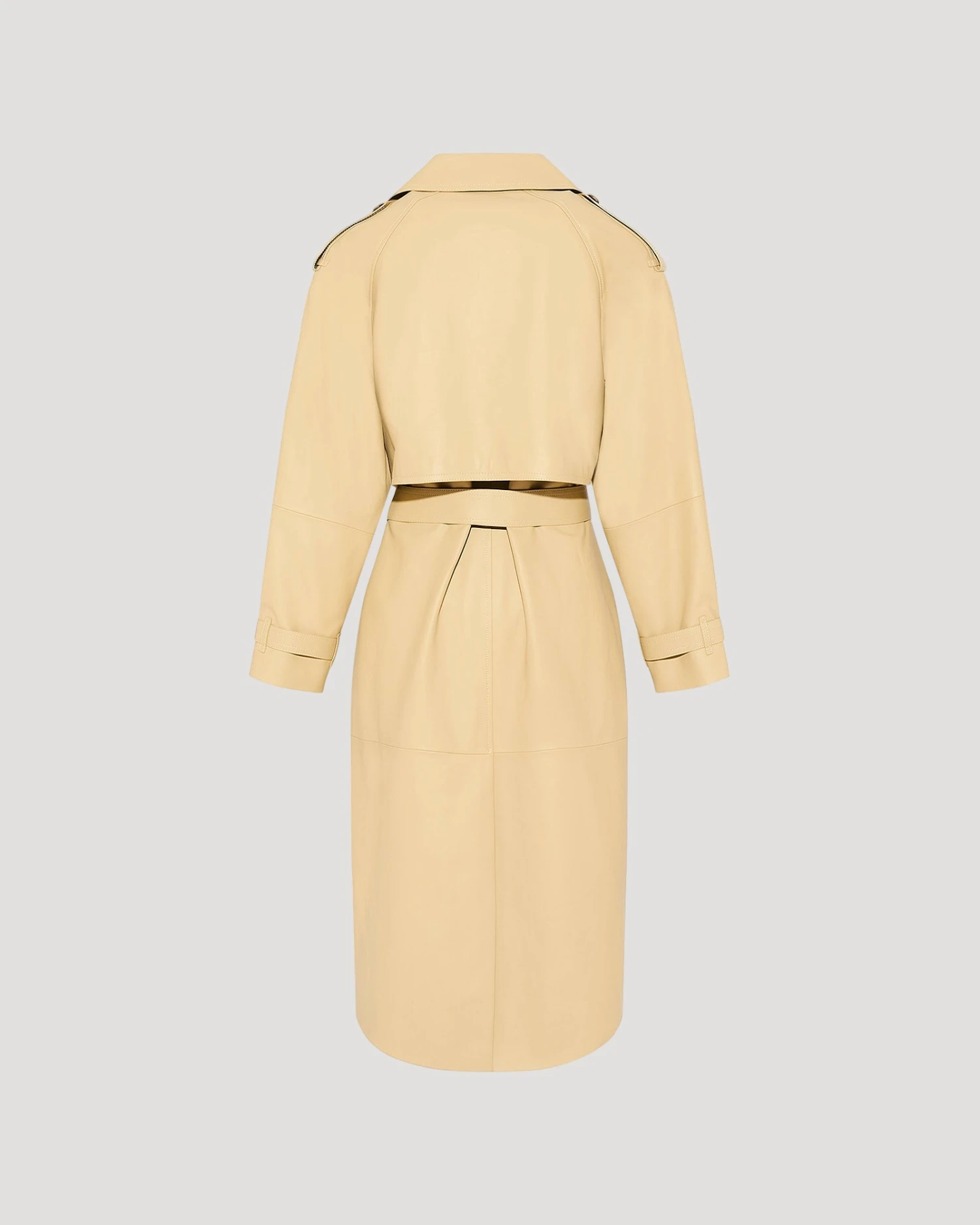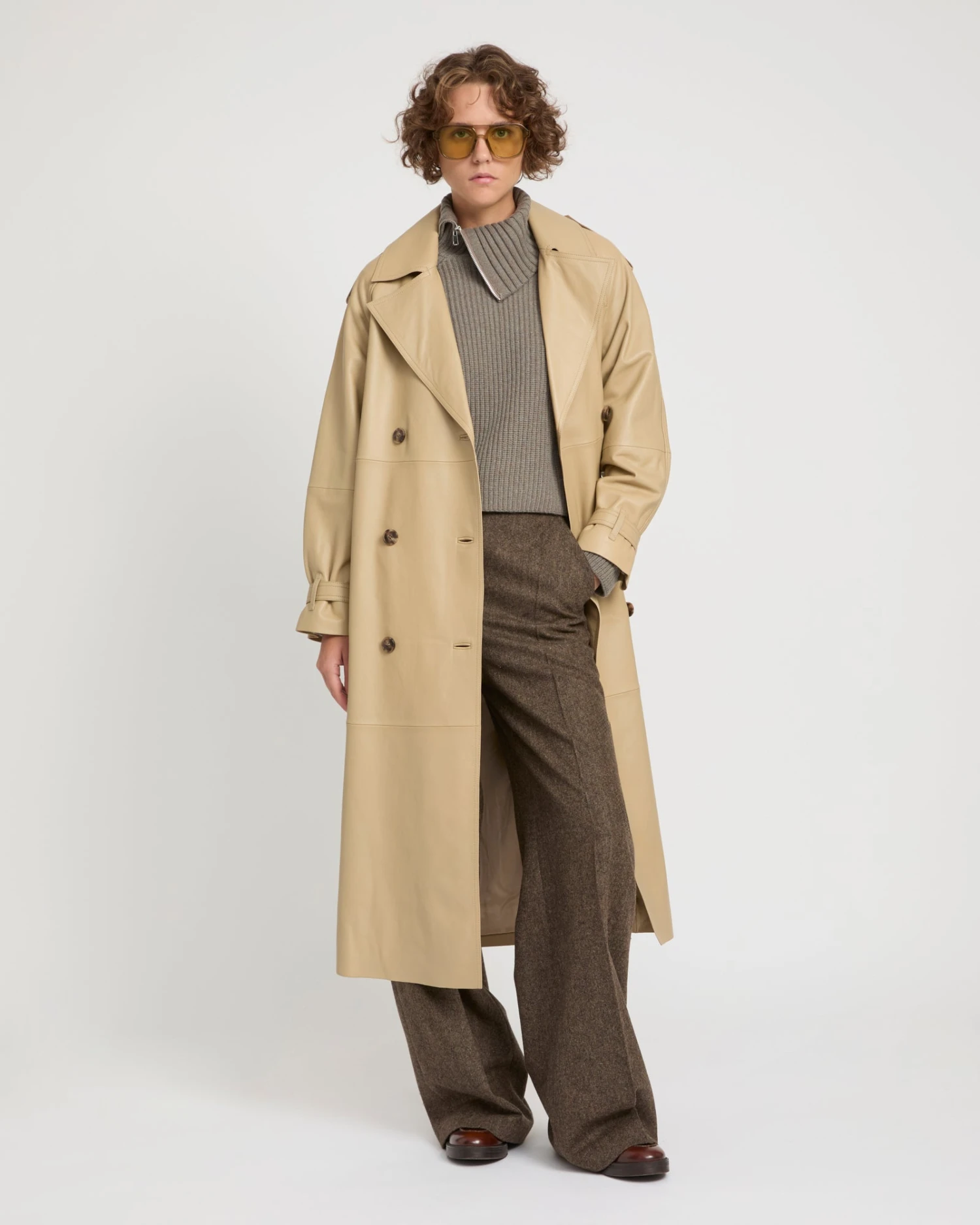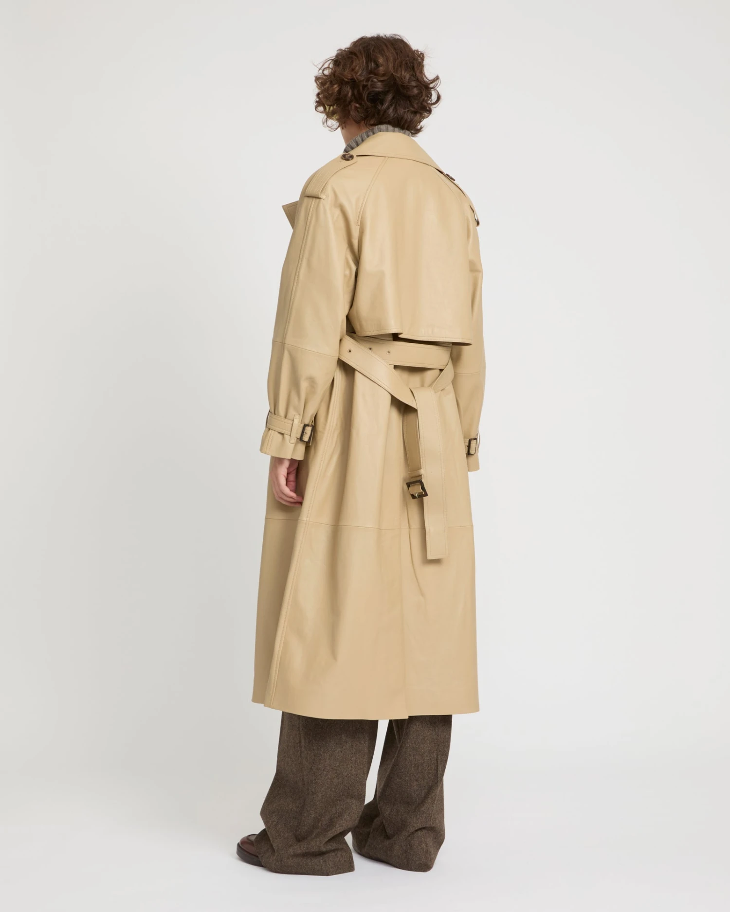 L’allure incomparable du trench, travaillé dans un cuir d’agneau lisse au tombé parfait. Avec son double boutonnage et ses épaules dotées de pattes, ce manteau apporte une sophistication immédiate à la silhouette. Une ceinture assortie permet de moduler le volume légèrement oversized de cette pièce phare à la coupe impeccable.