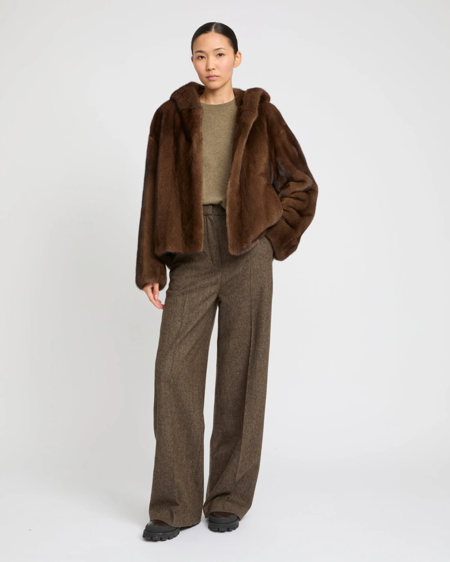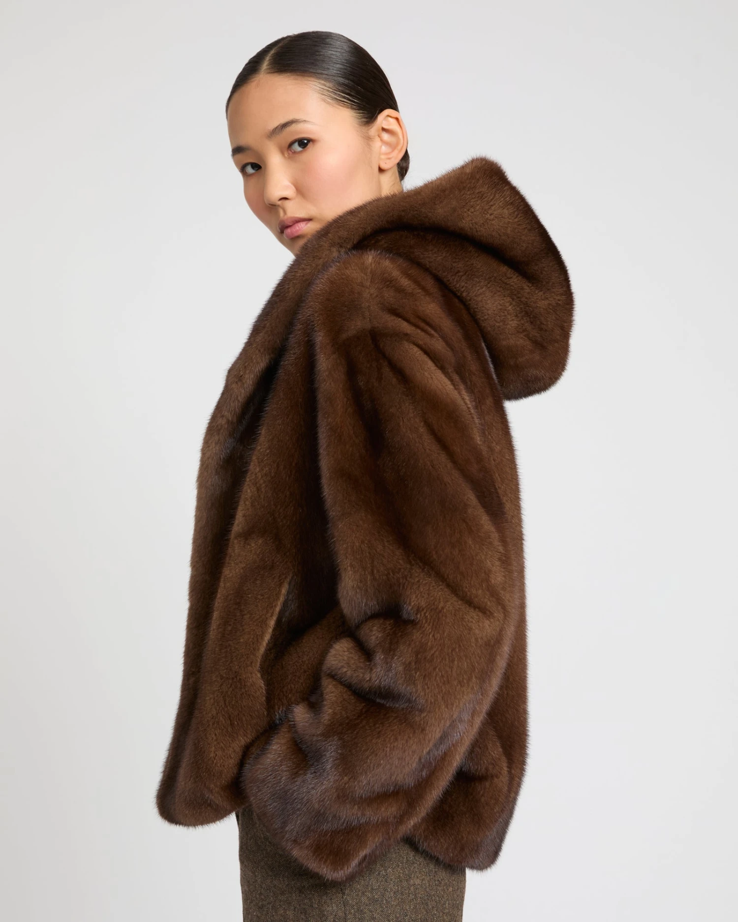 Une veste courte en fourrure de vison à poils longs, caractérisée par sa durabilité, son éclat ainsi que son élégance discrète et naturelle. Chaud et enveloppant, ce modèle est idéal pour l’hiver. Dotée de poches fentes et d’une fermeture par crochets, la coupe est minimaliste et les détails de style sont subtils. La capuche ajoute du contraste et de la modernité pour une allure à la fois féminine et décontractée.