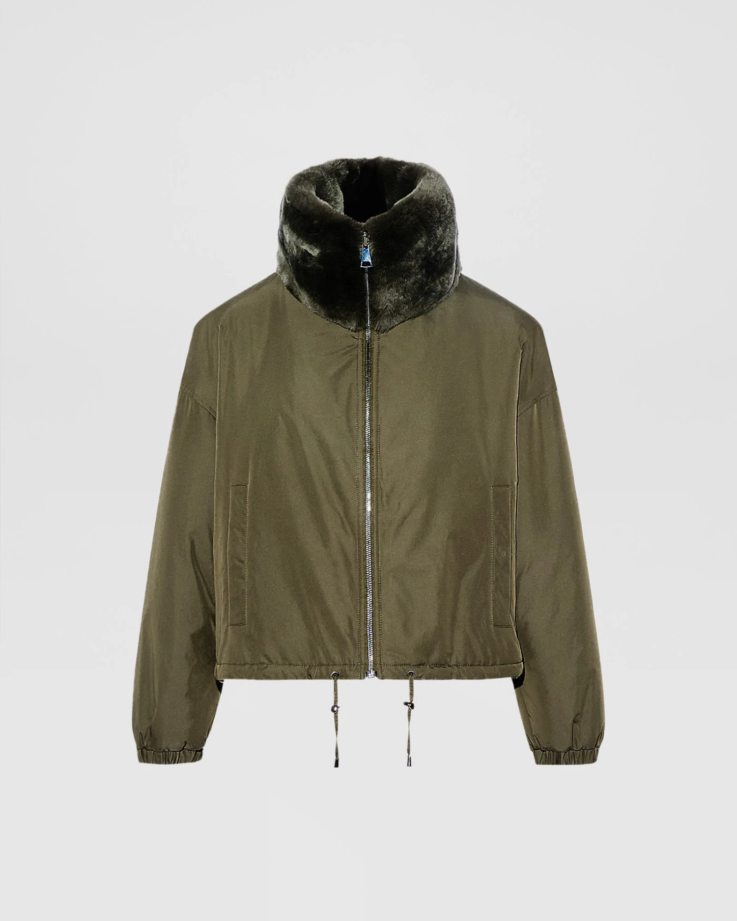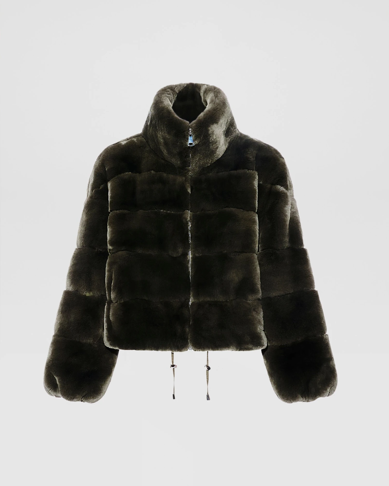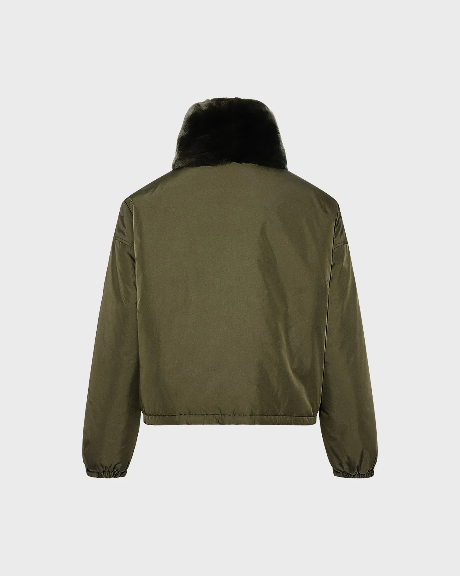 Versatilité et contraste des matières en évidence pour cette veste sportive zippée, dotée d’une coupe boxy. Une face en tissu technique dévoile un revers en fourrure de lapin rex douce et généreuse, travaillée en bandes façon matelassage doudoune. Un col plat montant met en valeur la fourrure de rex sur les deux faces.