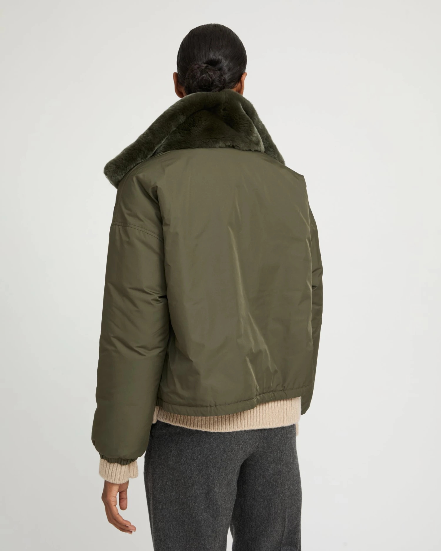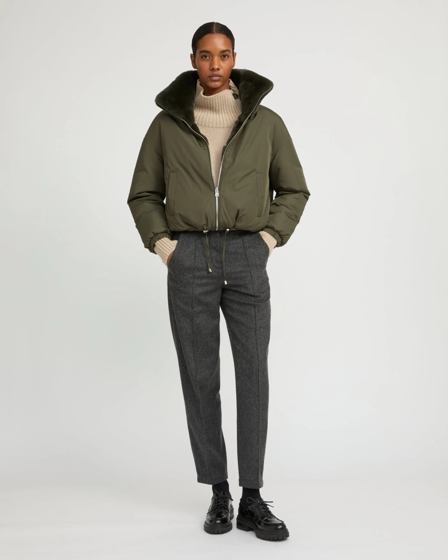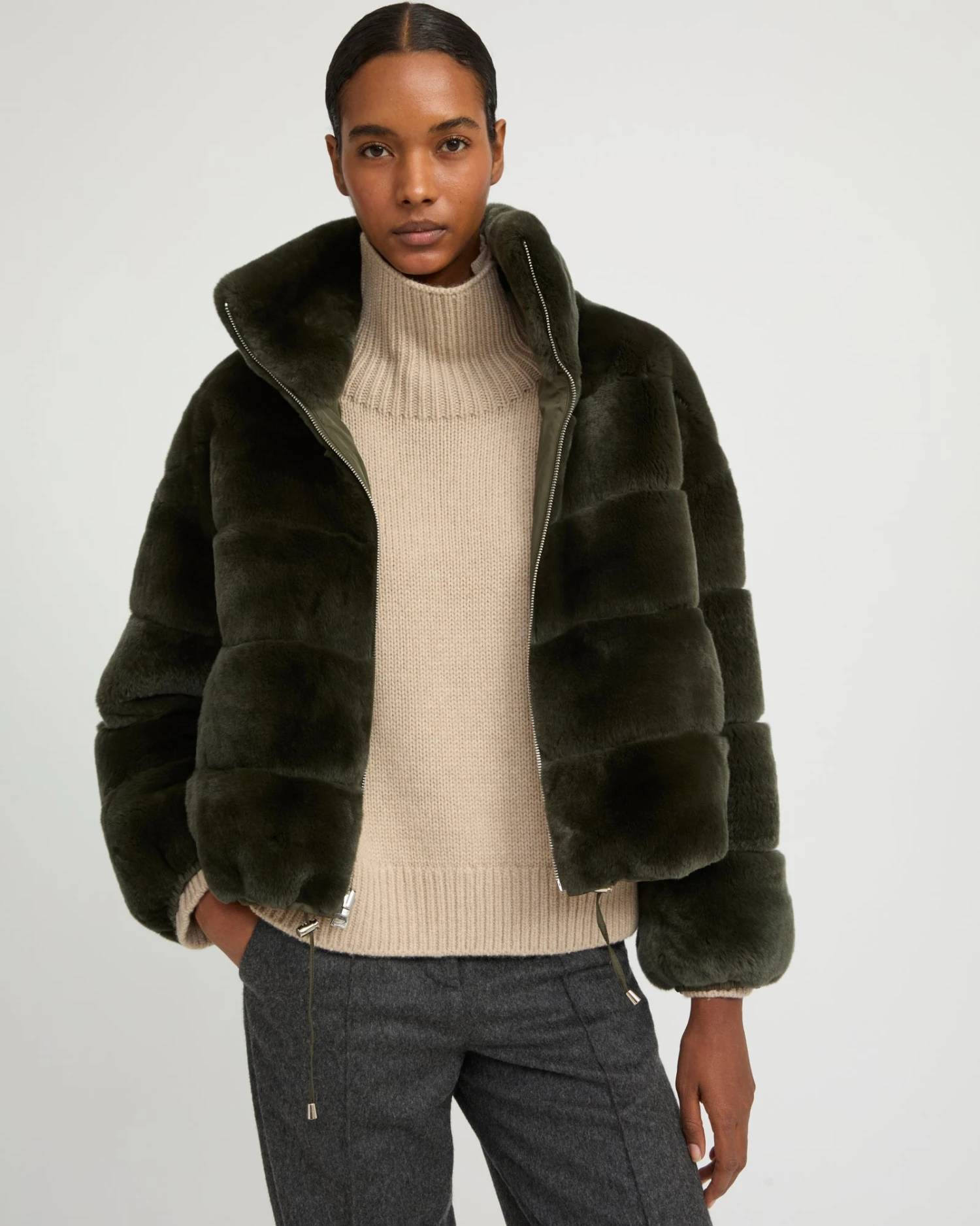Versatilité et contraste des matières en évidence pour cette veste sportive zippée, dotée d’une coupe boxy. Une face en tissu technique dévoile un revers en fourrure de lapin rex douce et généreuse, travaillée en bandes façon matelassage doudoune. Un col plat montant met en valeur la fourrure de rex sur les deux faces.