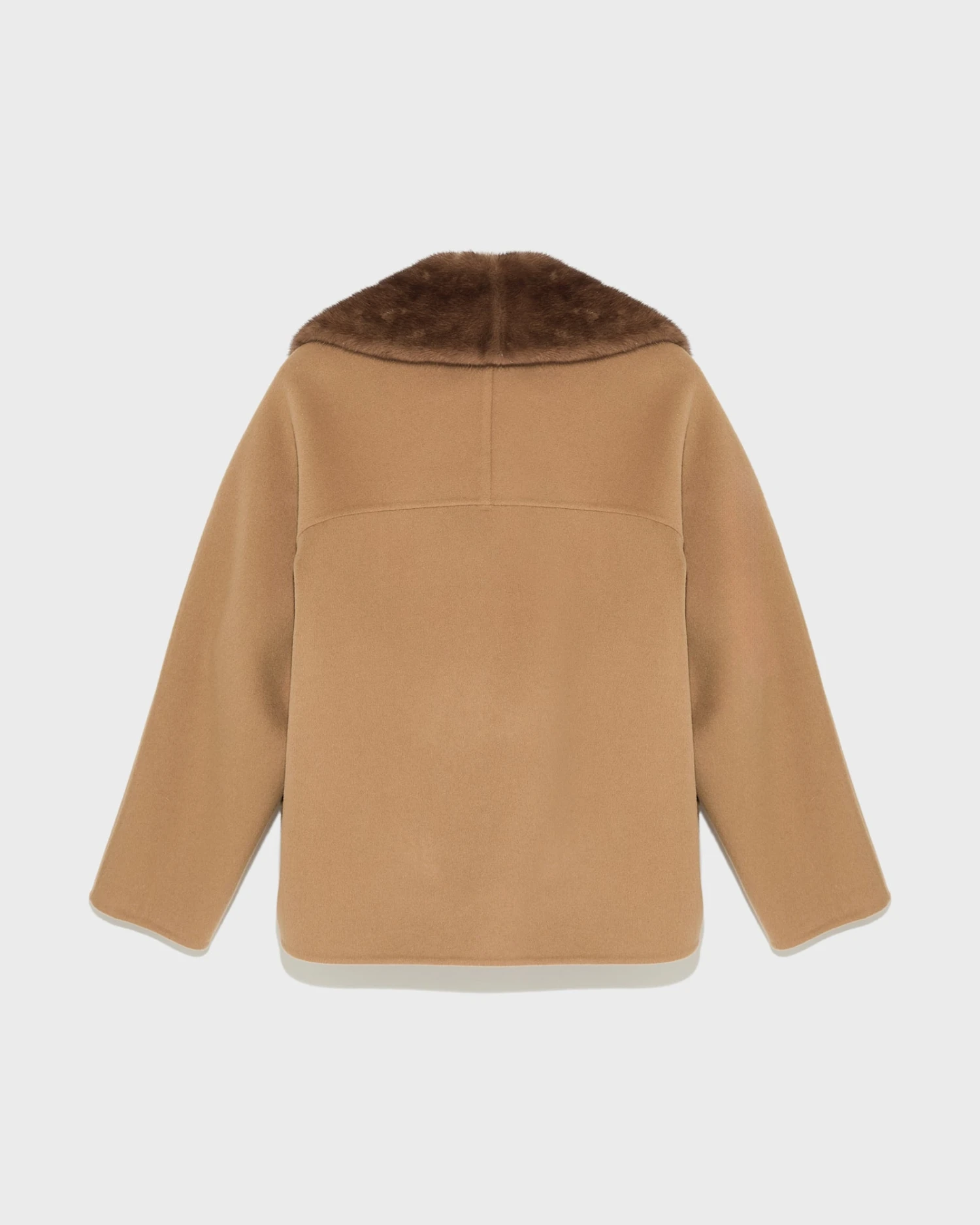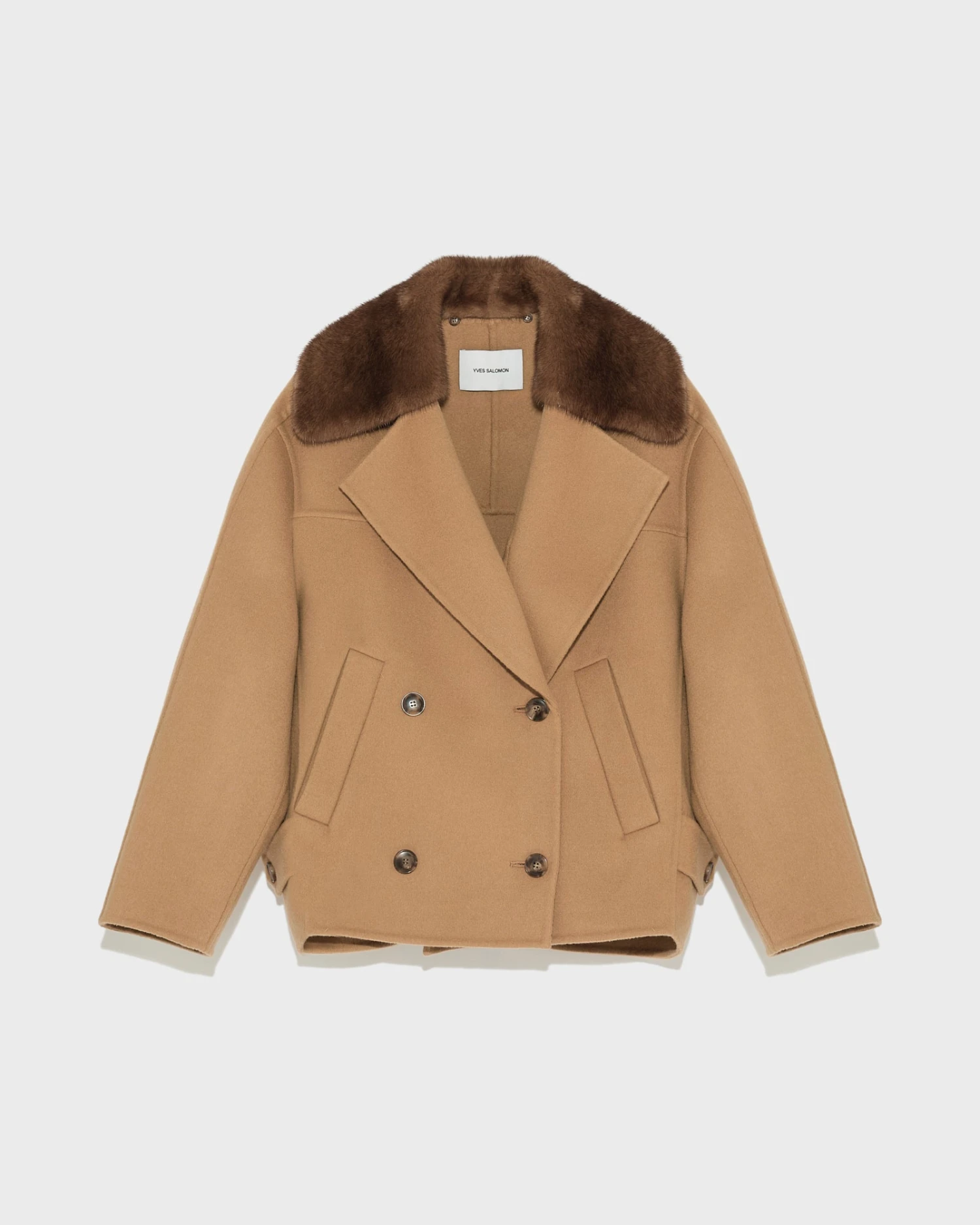 Les formes généreuses de cette veste ample s’inspirent du caban, avec un double boutonnage et des poches côté. La main chaleureuse d’une matière en cachemire et laine s’augmente de la douceur un col en vison, amovible pour plus de versatilité.