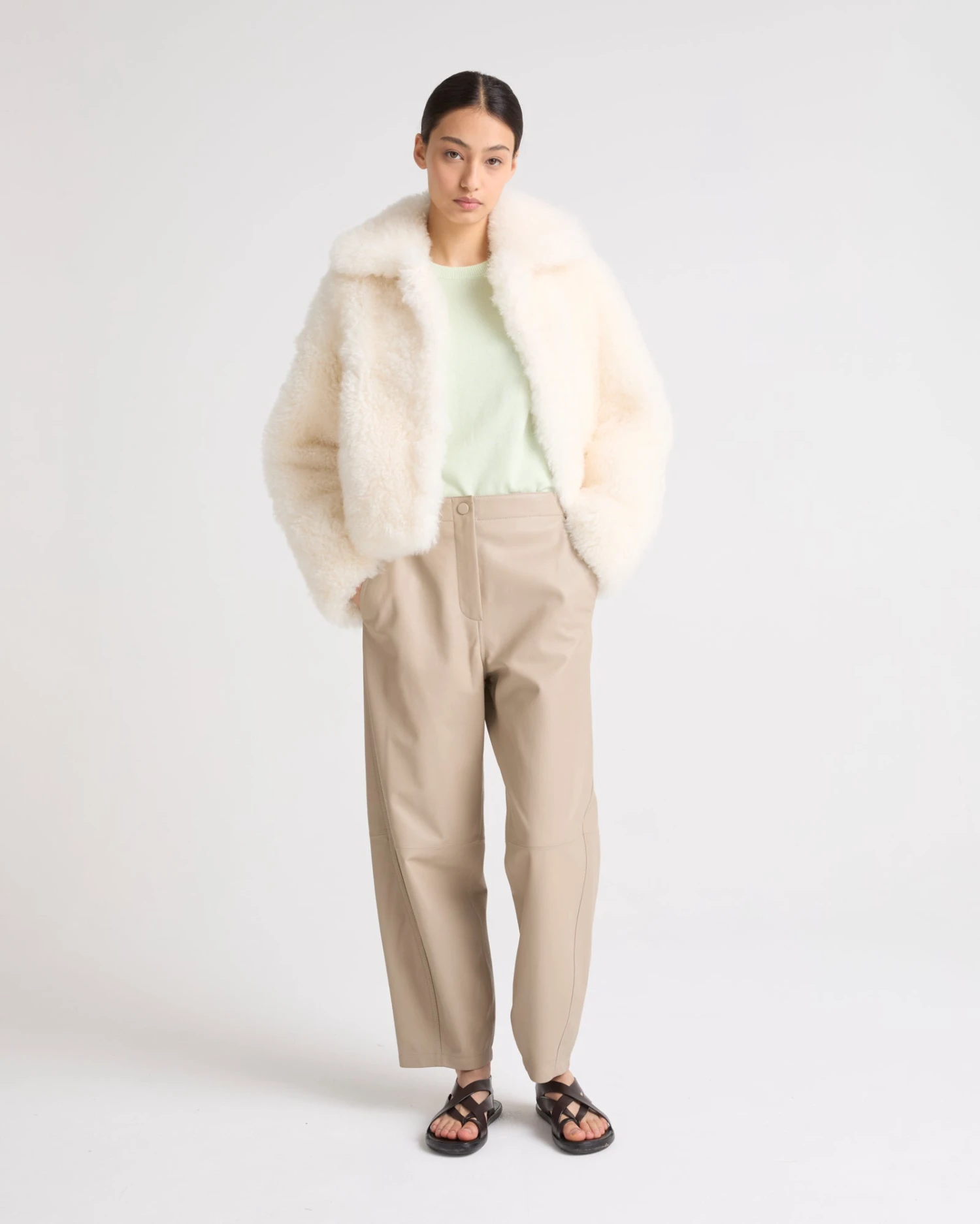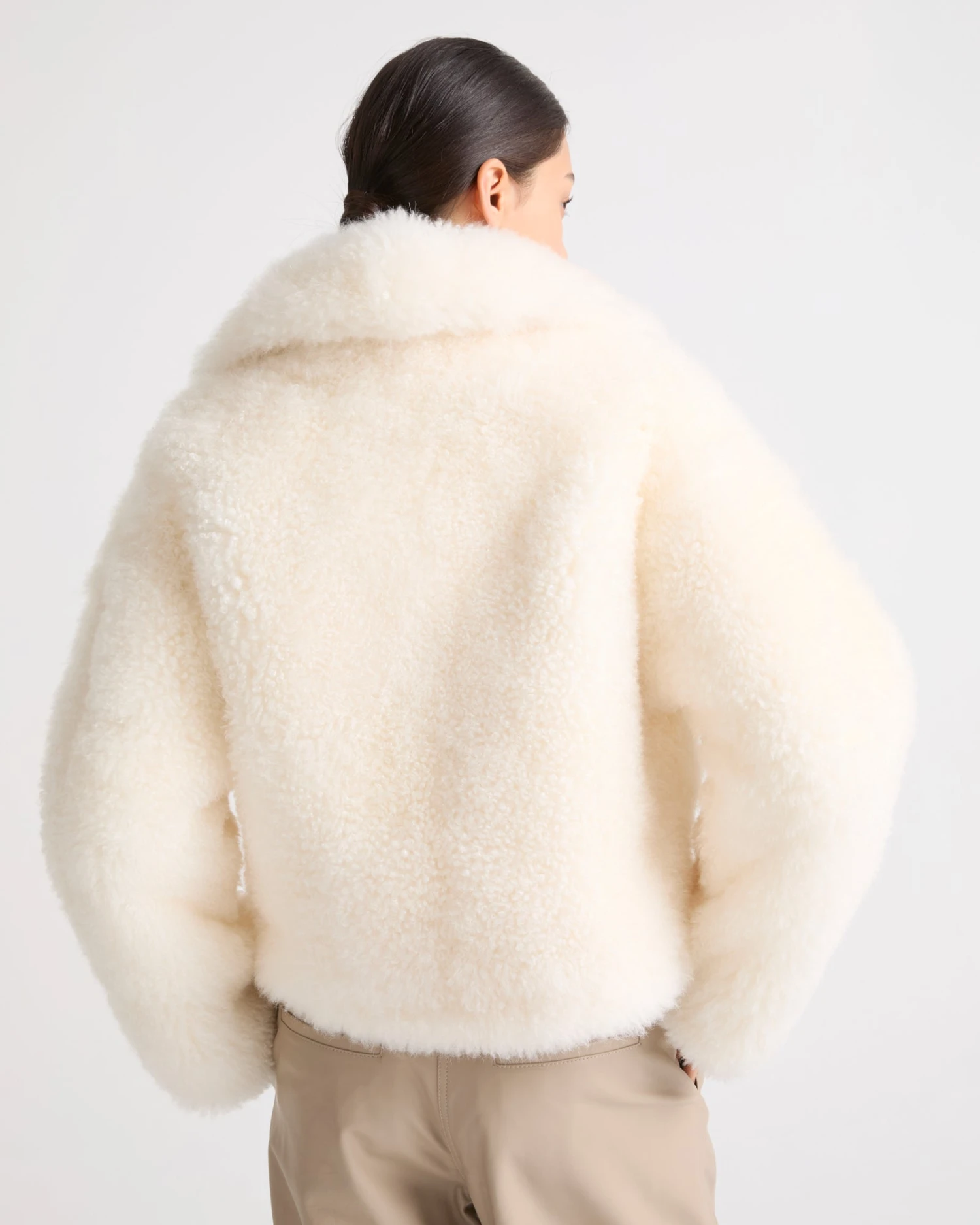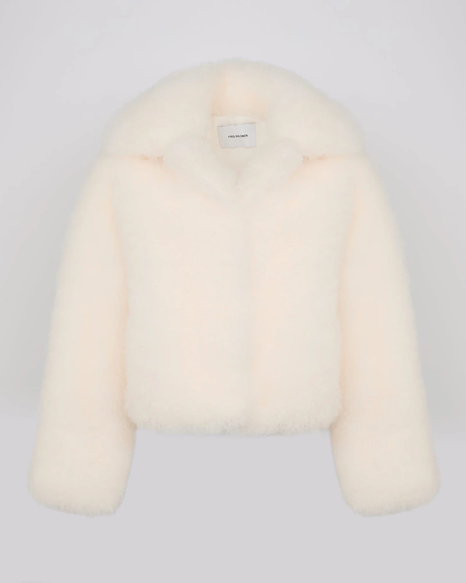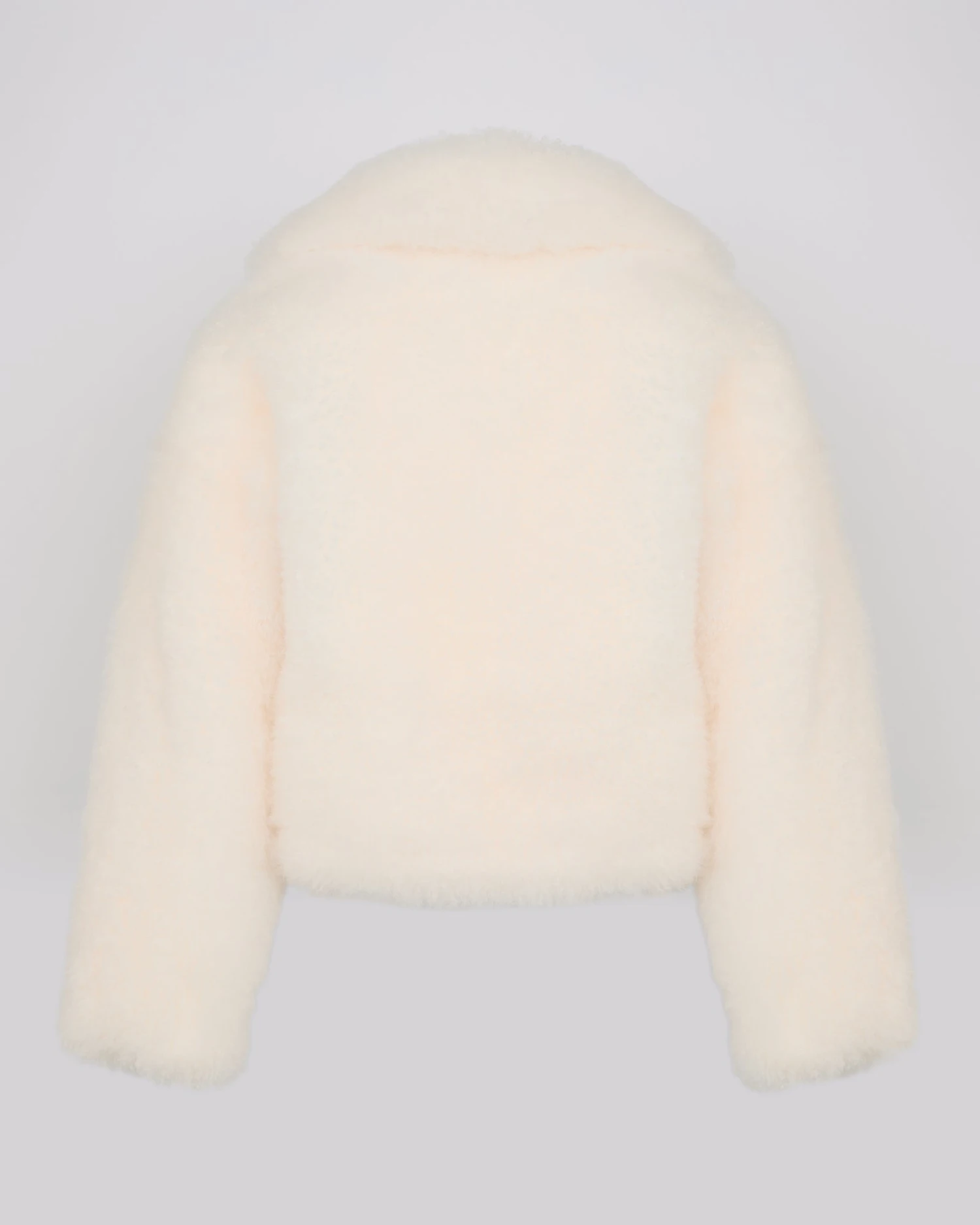 Visuel vaporeux et douceur absolue pour cette petite veste courte au col plat, conçue en agneau cachemire frisé léger et chaleureux. La fermeture invisible par crochets rajoute à l’effet aérien de ce modèle à l’élégance épurée.
