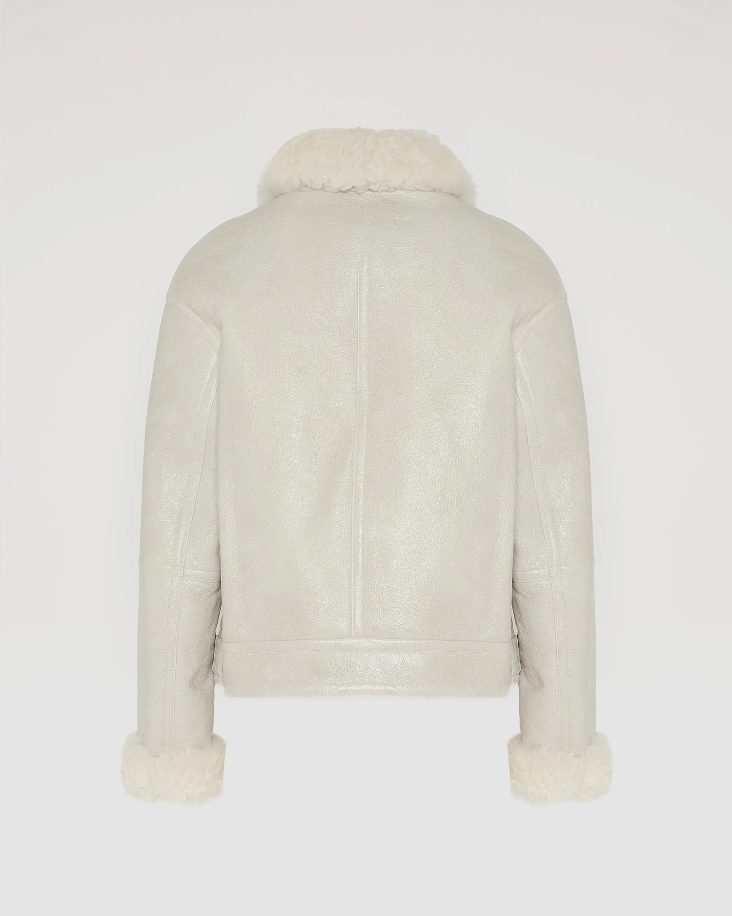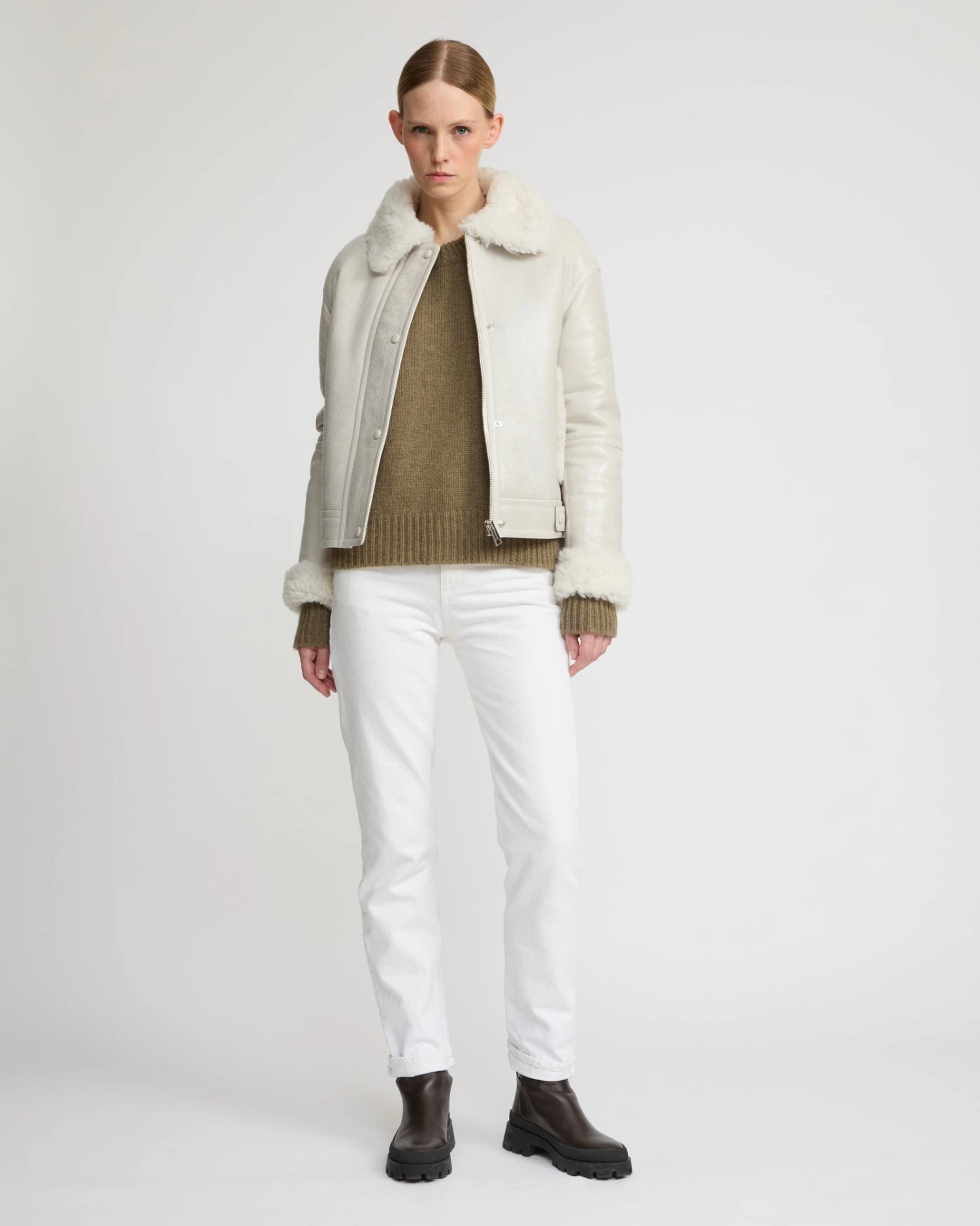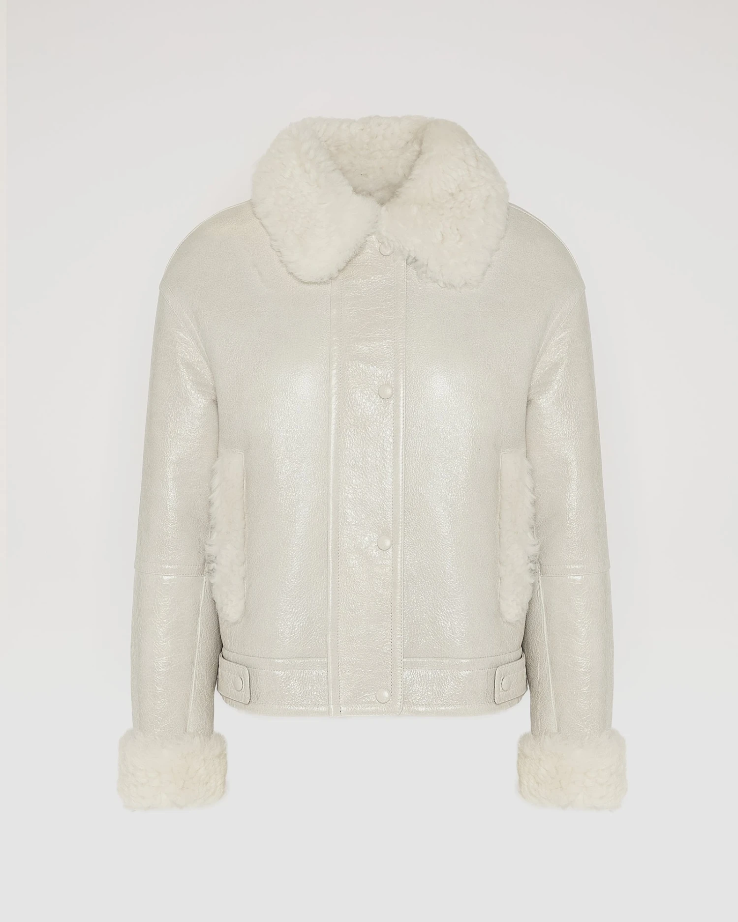 Une petite veste qui joue les effets de texture, avec sa face extérieure en cuir brillant effet vintage, et le poil bouclé de l’agneau de Toscane curly qui apporte sa touche plus rock, visible au col, sur les revers de poignets et au niveau des poches. Une coupe carrée près du corps complète le charme retro de cette pièce, qui ne passe pas inaperçue.