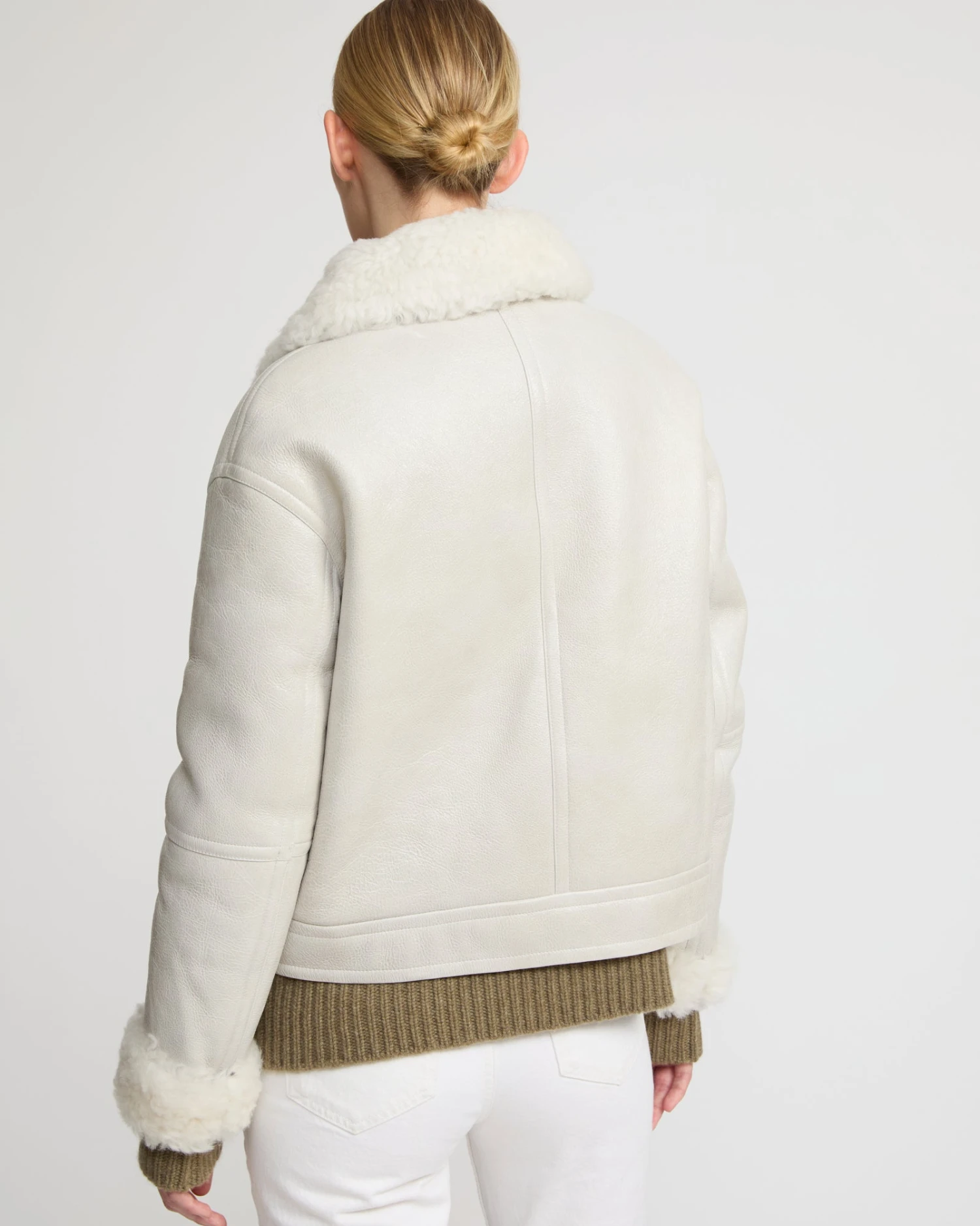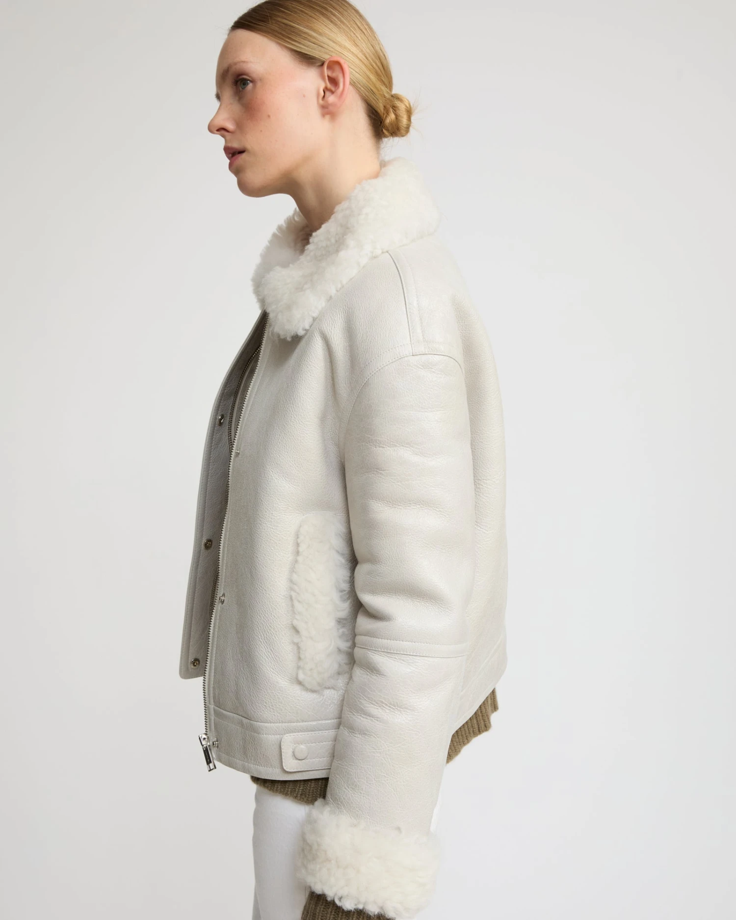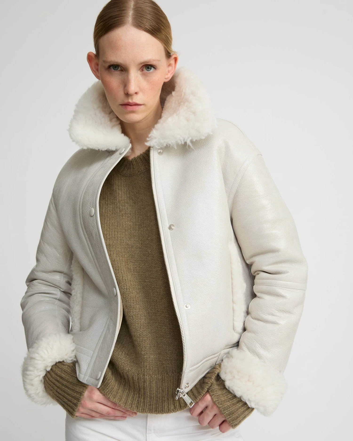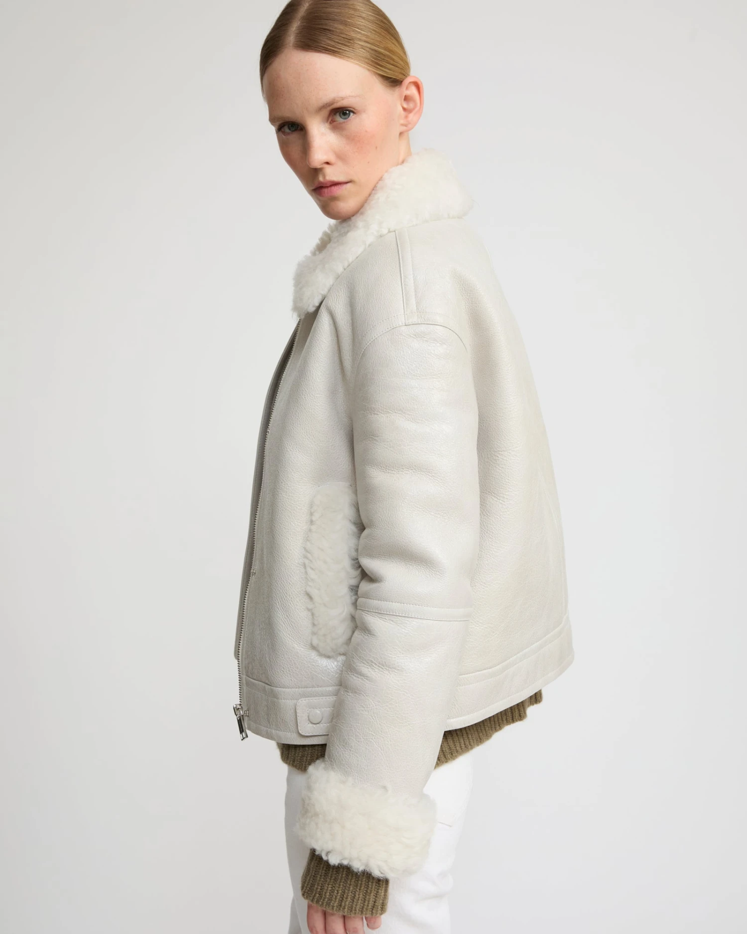 Une petite veste qui joue les effets de texture, avec sa face extérieure en cuir brillant effet vintage, et le poil bouclé de l’agneau de Toscane curly qui apporte sa touche plus rock, visible au col, sur les revers de poignets et au niveau des poches. Une coupe carrée près du corps complète le charme retro de cette pièce, qui ne passe pas inaperçue.
