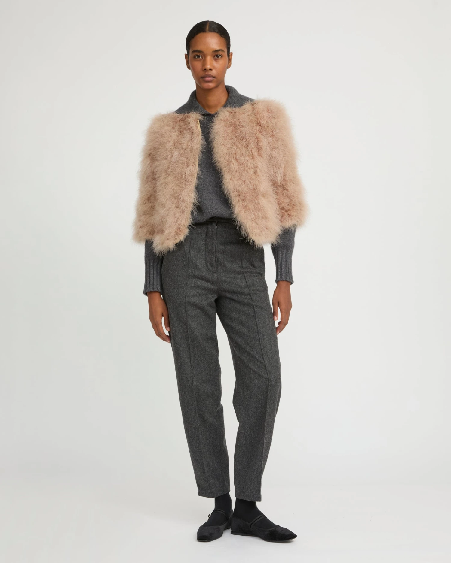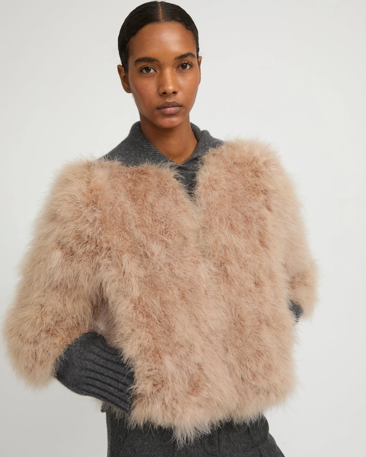 Une interprétation moderne de la veste en plumes pour un style à la fois unique et versatile. Dotée d’une encolure arrondie, de manches 3/4 et d’une fermeture par crochets, sa ligne est épurée et vaporeuse, et sa coupe est contemporaine. Confortable et respirante, sa doublure est en soie. Un modèle léger et aérien qui s’accorde facilement aux autres pièces de la collection pour une silhouette habillée ou plus décontractée.