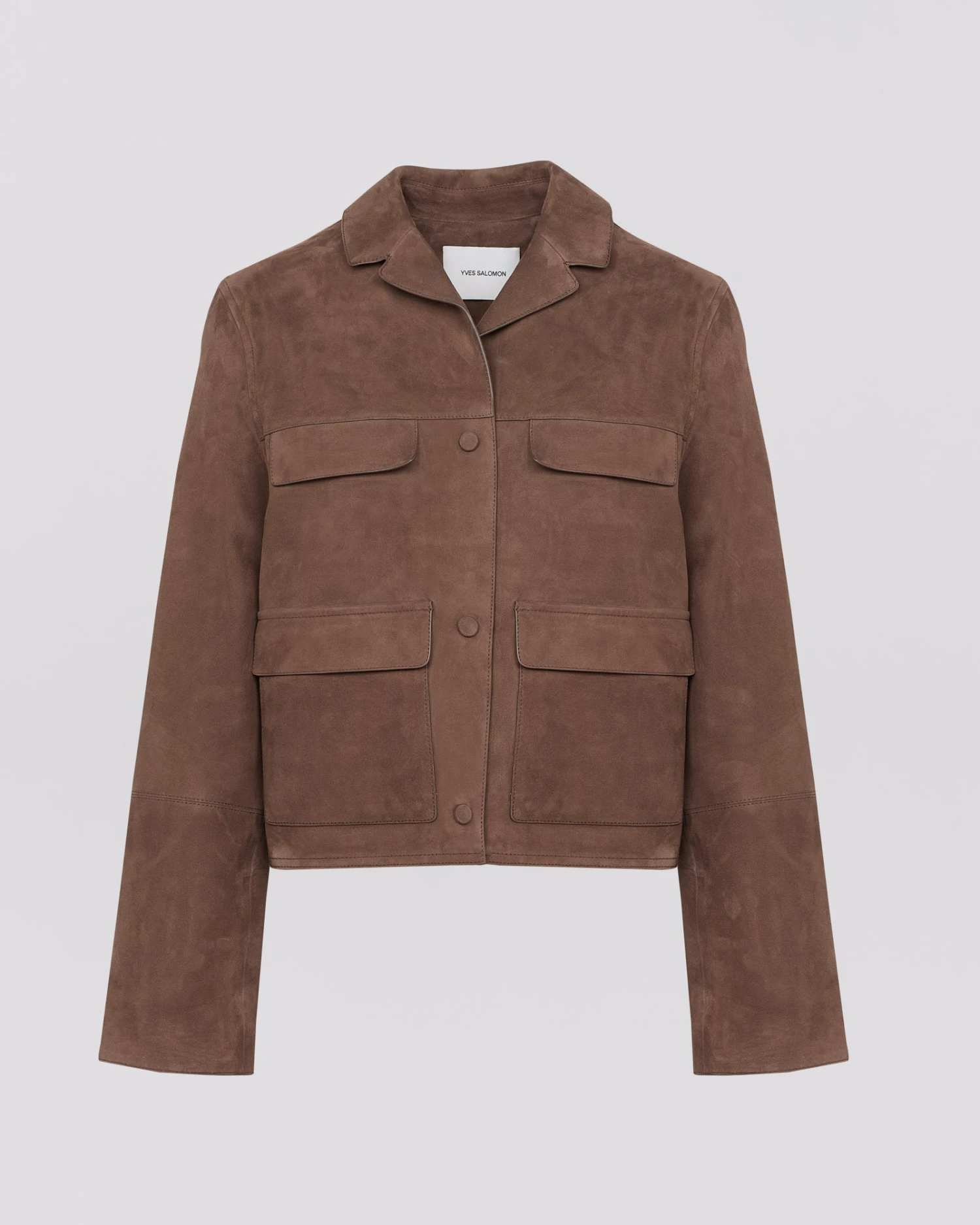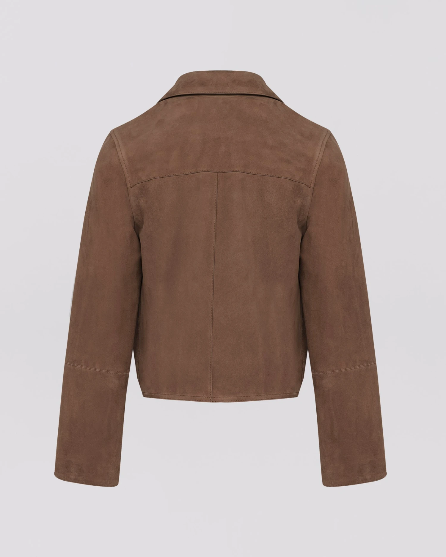 L’élégance d’une veste courte dont la coupe droite souligne les mouvements du corps. Quatre poches plaquées – deux au bas et deux à la poitrine – créent un effet graphique, tandis que le petit col chemise permet de dévoiler ou non la naissance du cou. La matière double-face apporte son velouté luxueux, complété par des pressions recouvertes du même cuir. La veste peut se porter en superposition ou à même le corps.