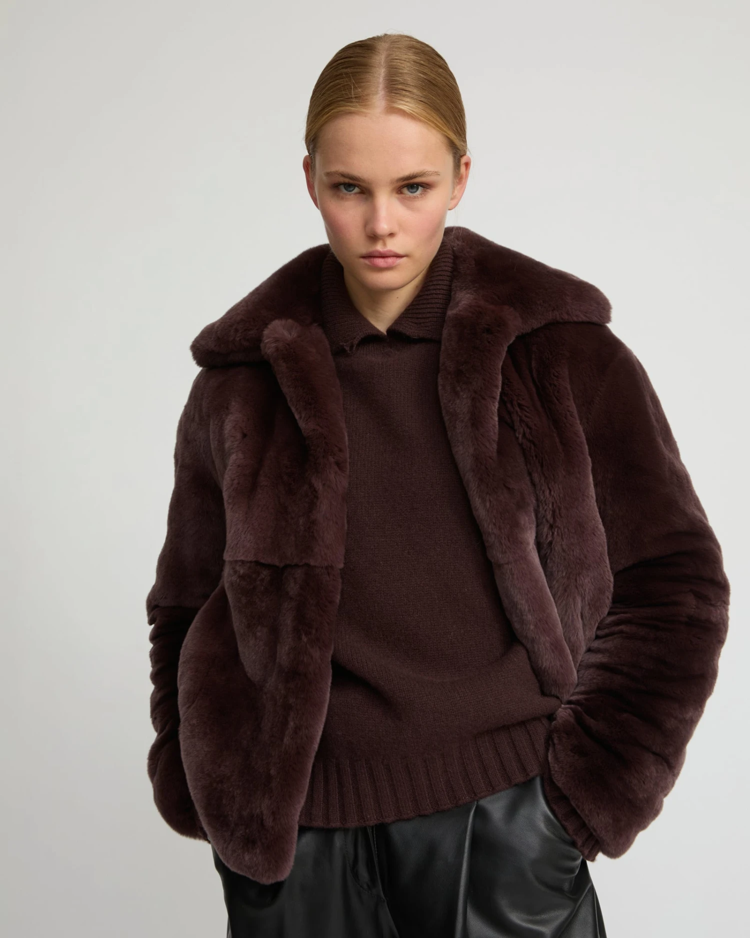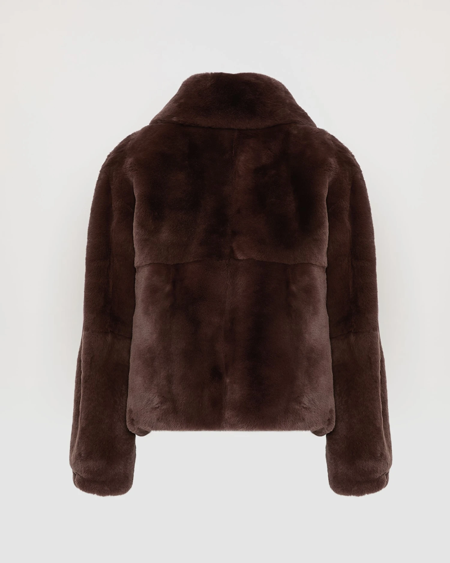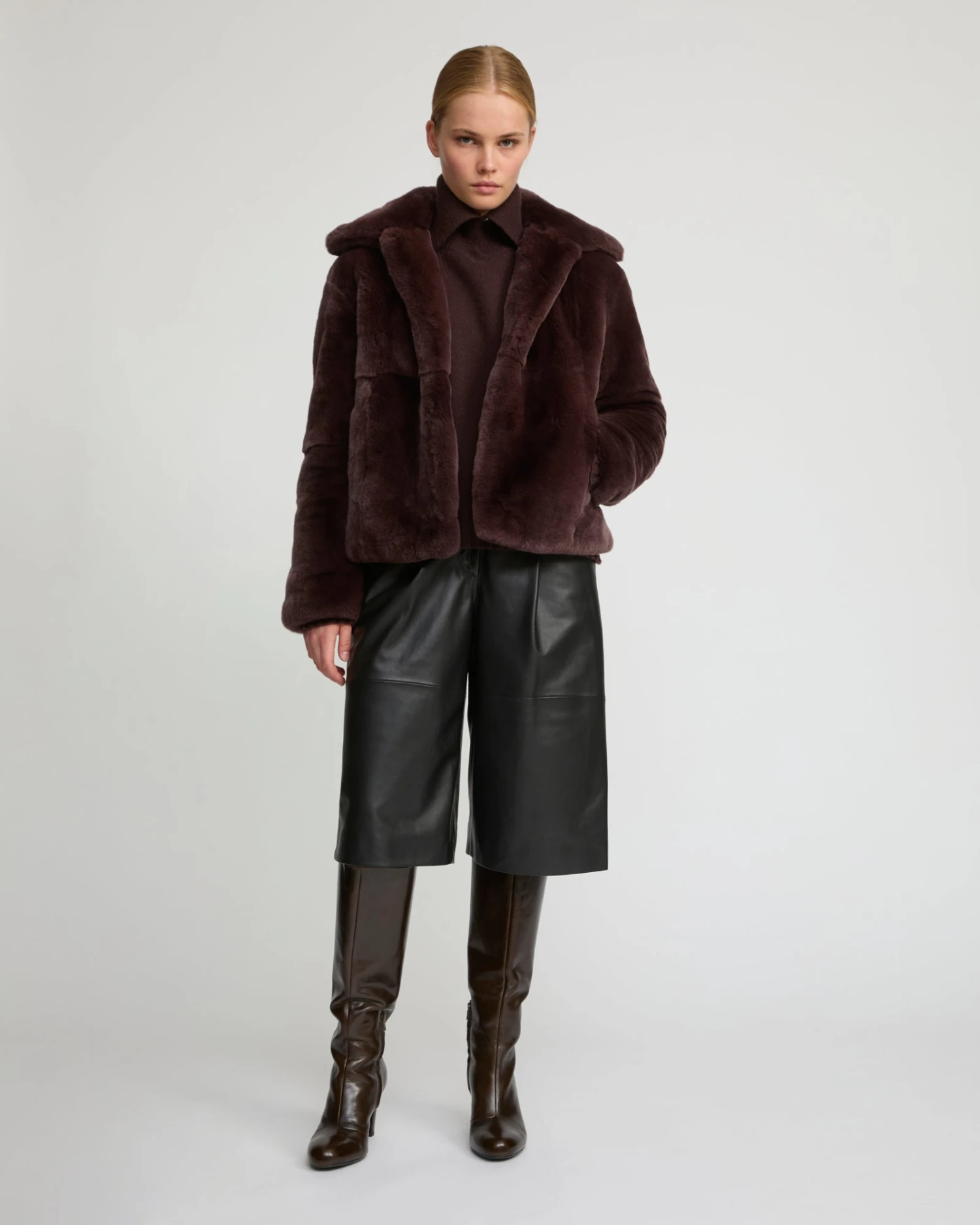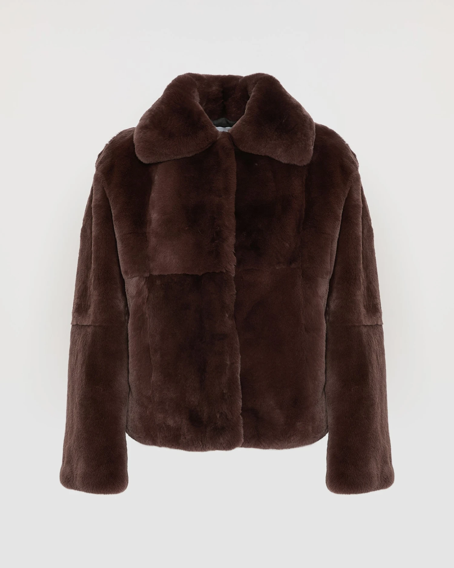 L’élégante simplicité d’une petite veste droite au petit col plat, travaillée dans une douce fourrure de lapin rex. La fermeture par crochets apporte un visuel épuré et discret.