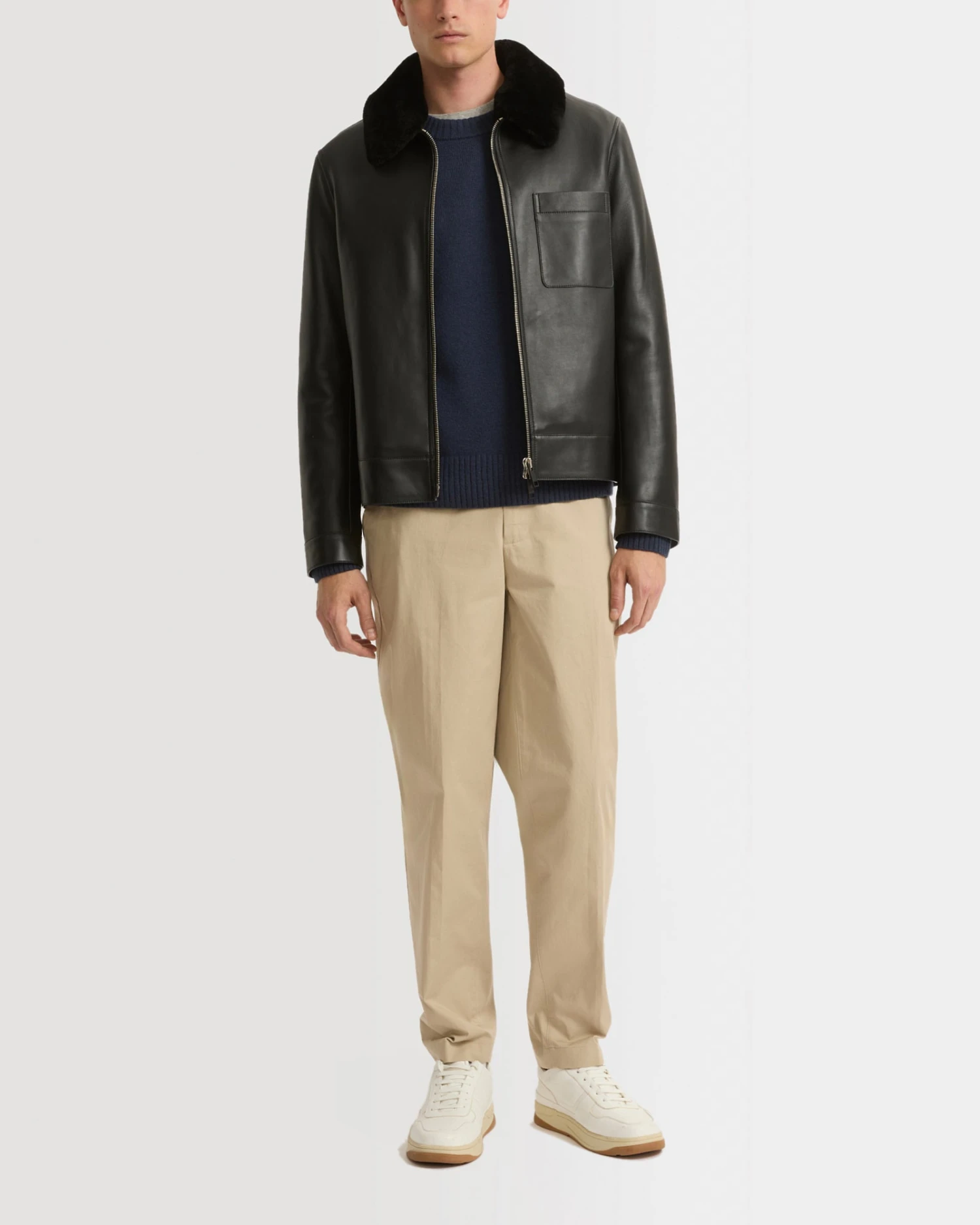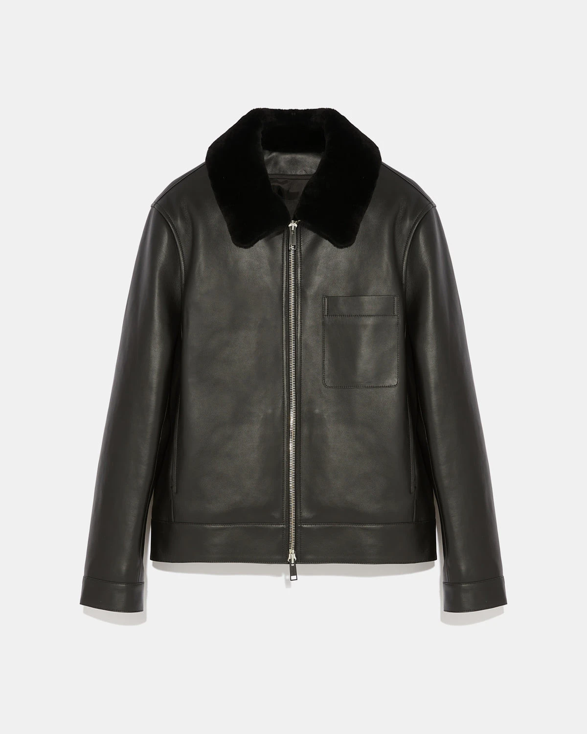 L’incontournable veste zippée en cuir lisse, avec sa forme courte et ses lignes classiques. Un col amovible en peau lainée permet d’apporter une touche de chaleur et de versatilité à ce modèle doublé, doté de deux poches.