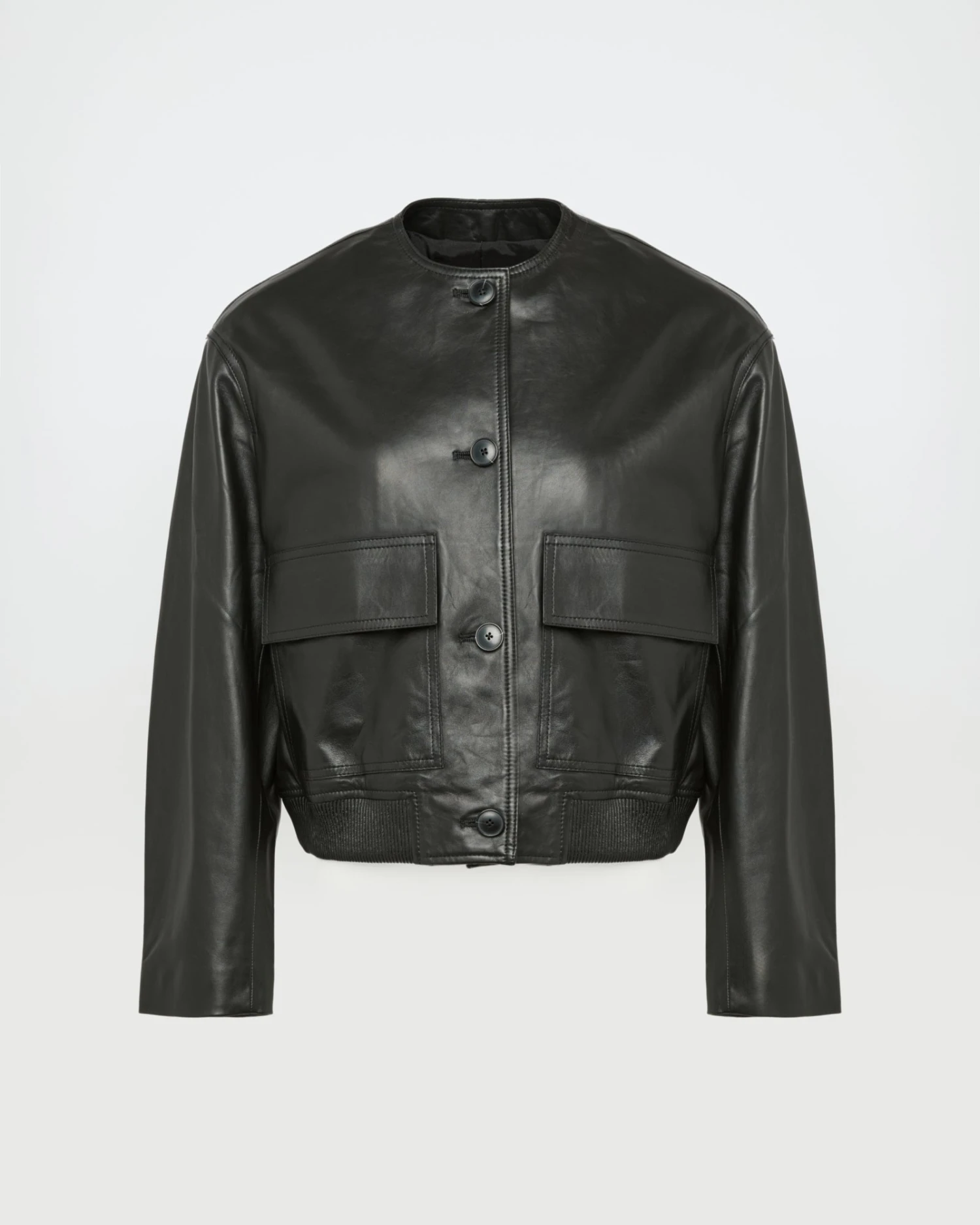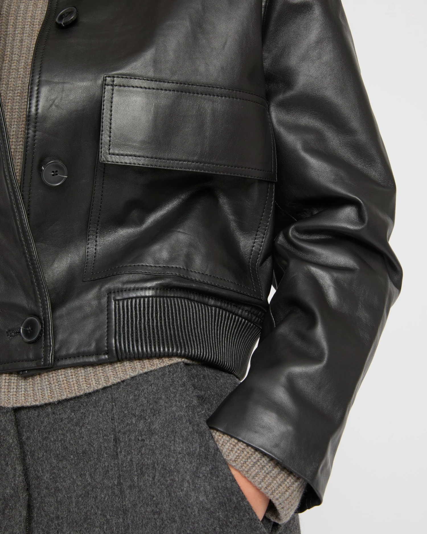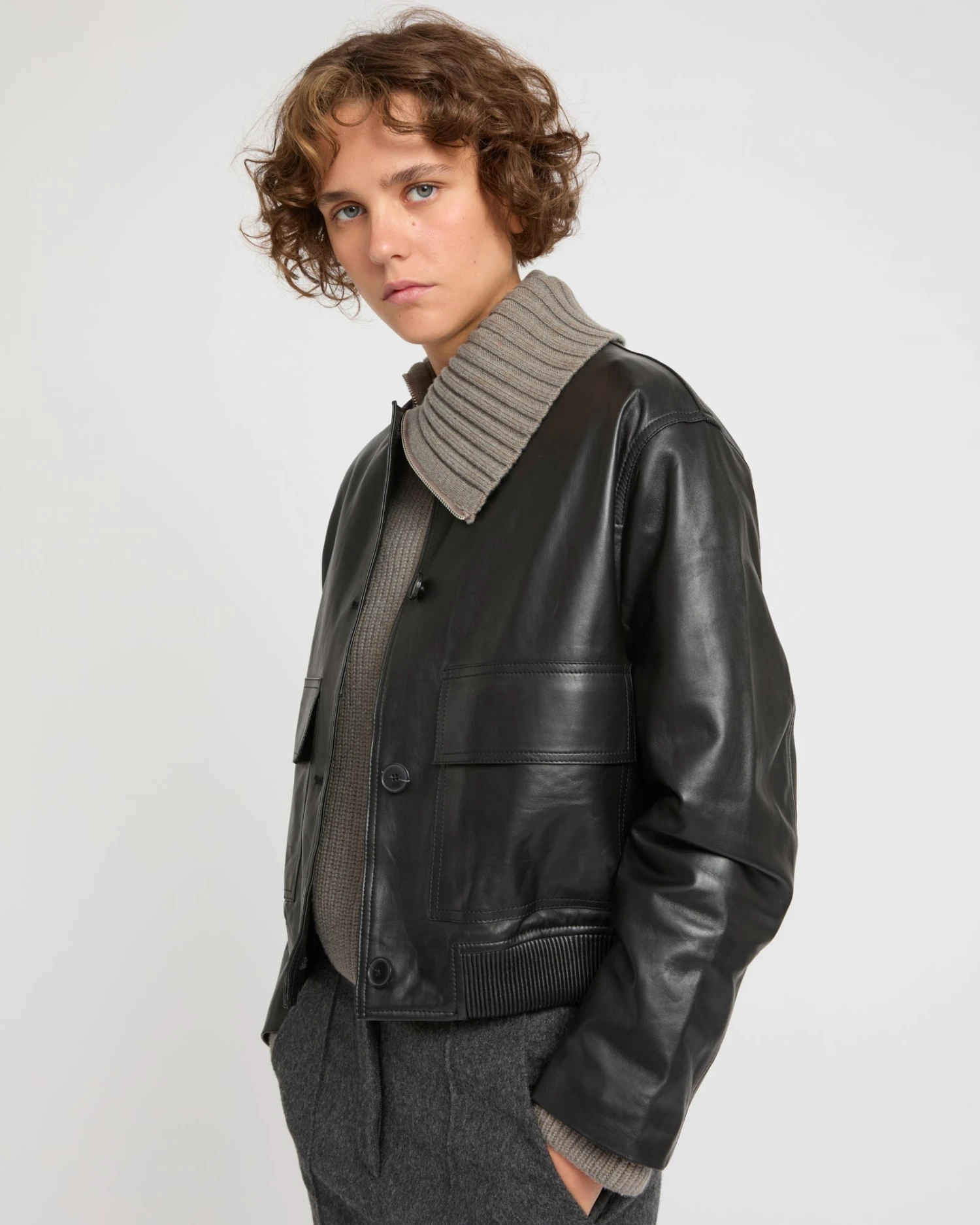 Une veste courte en cuir d’agneau lisse et brillant, avec un col rond qui met en valeur le visage. Fermée par des boutons ton sur ton, elle propose deux grandes poches à rabat et une finition en cuir façon bords côtes au bas.