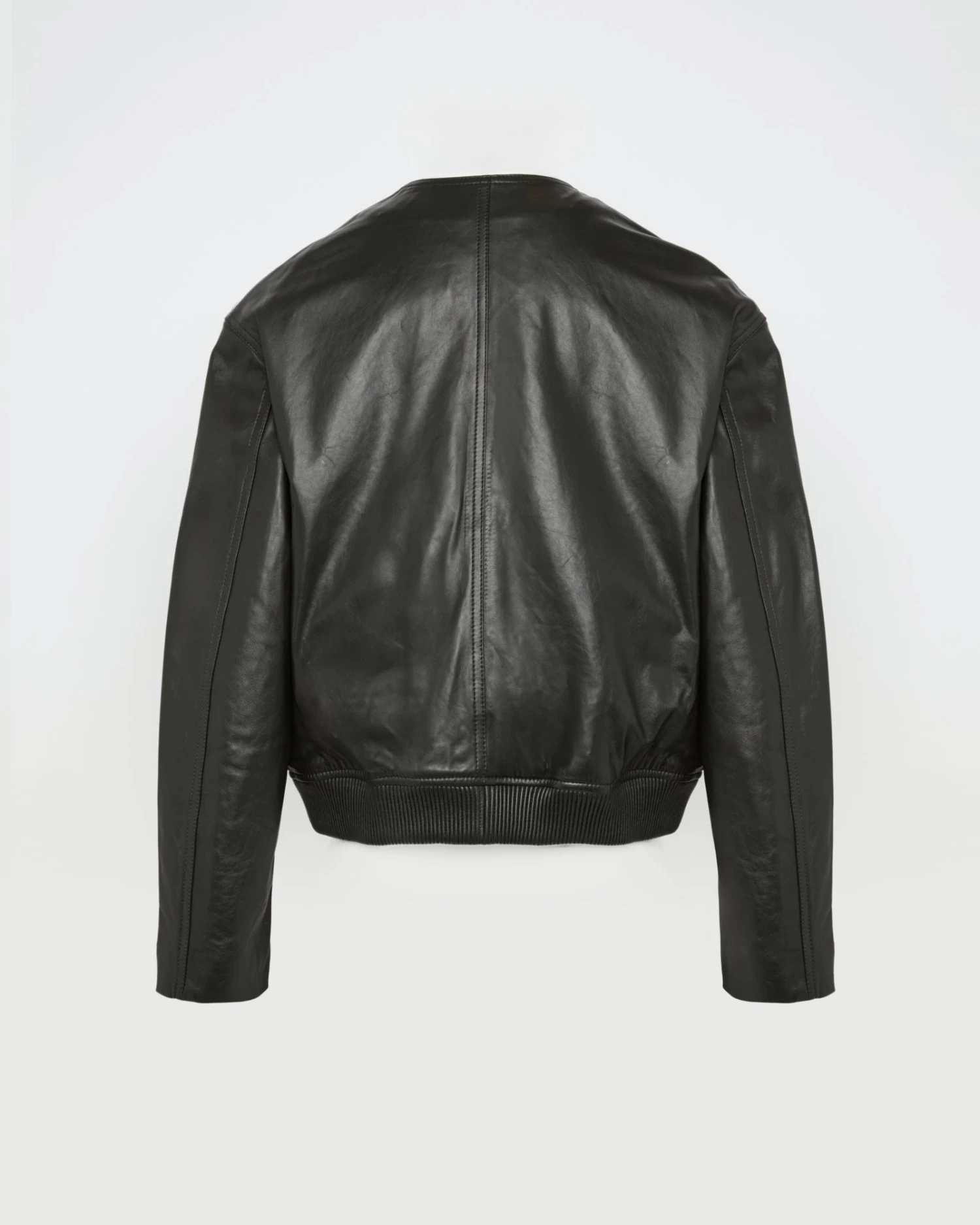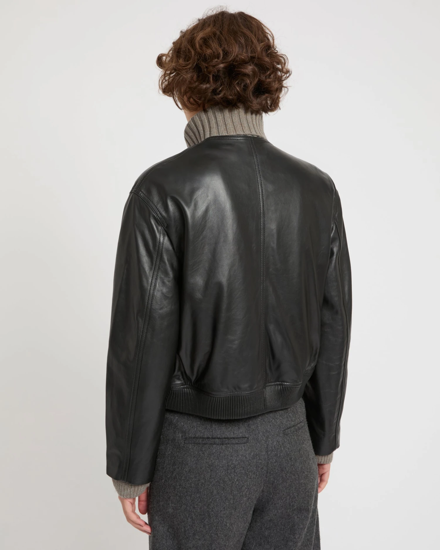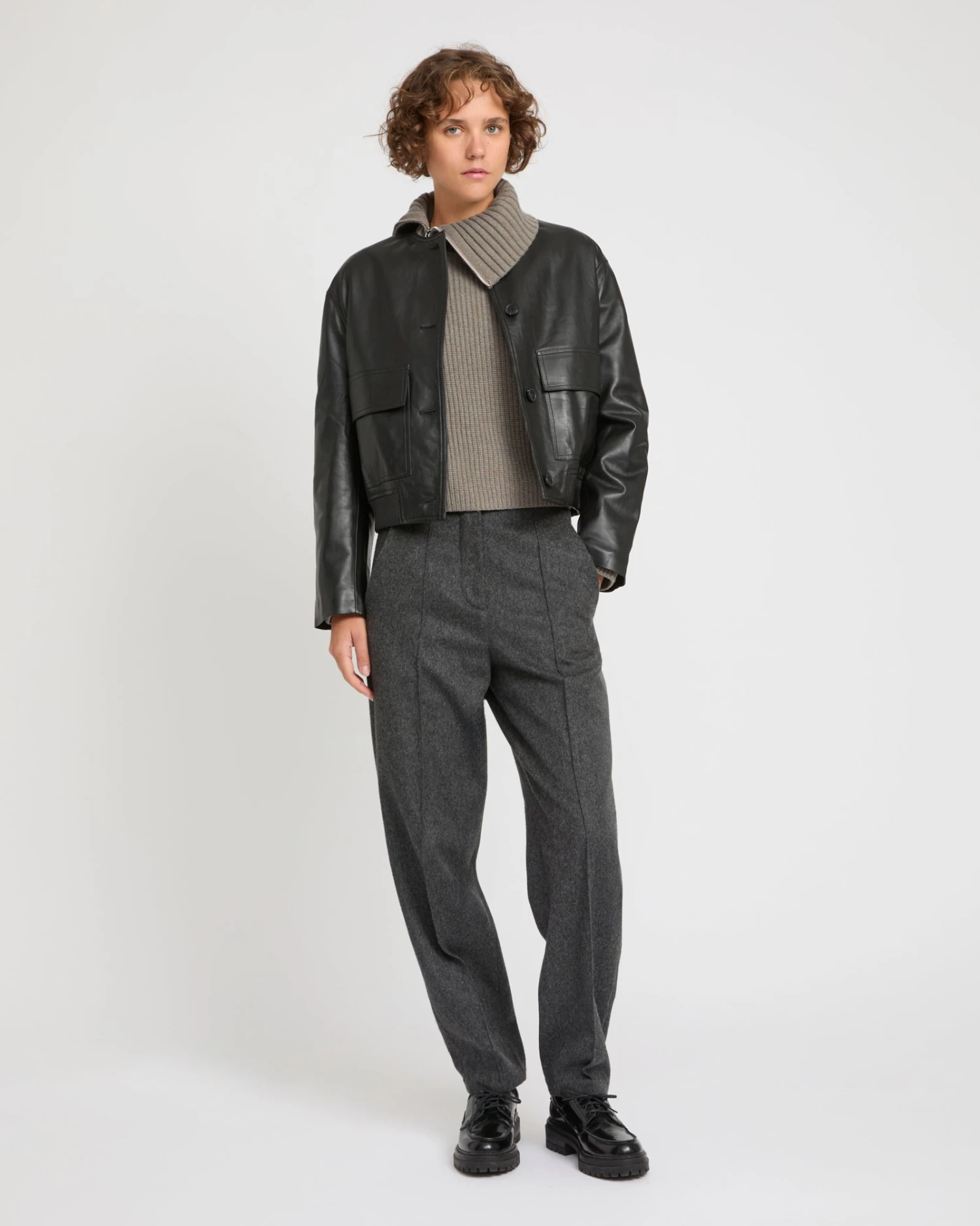 Une veste courte en cuir d’agneau lisse et brillant, avec un col rond qui met en valeur le visage. Fermée par des boutons ton sur ton, elle propose deux grandes poches à rabat et une finition en cuir façon bords côtes au bas.