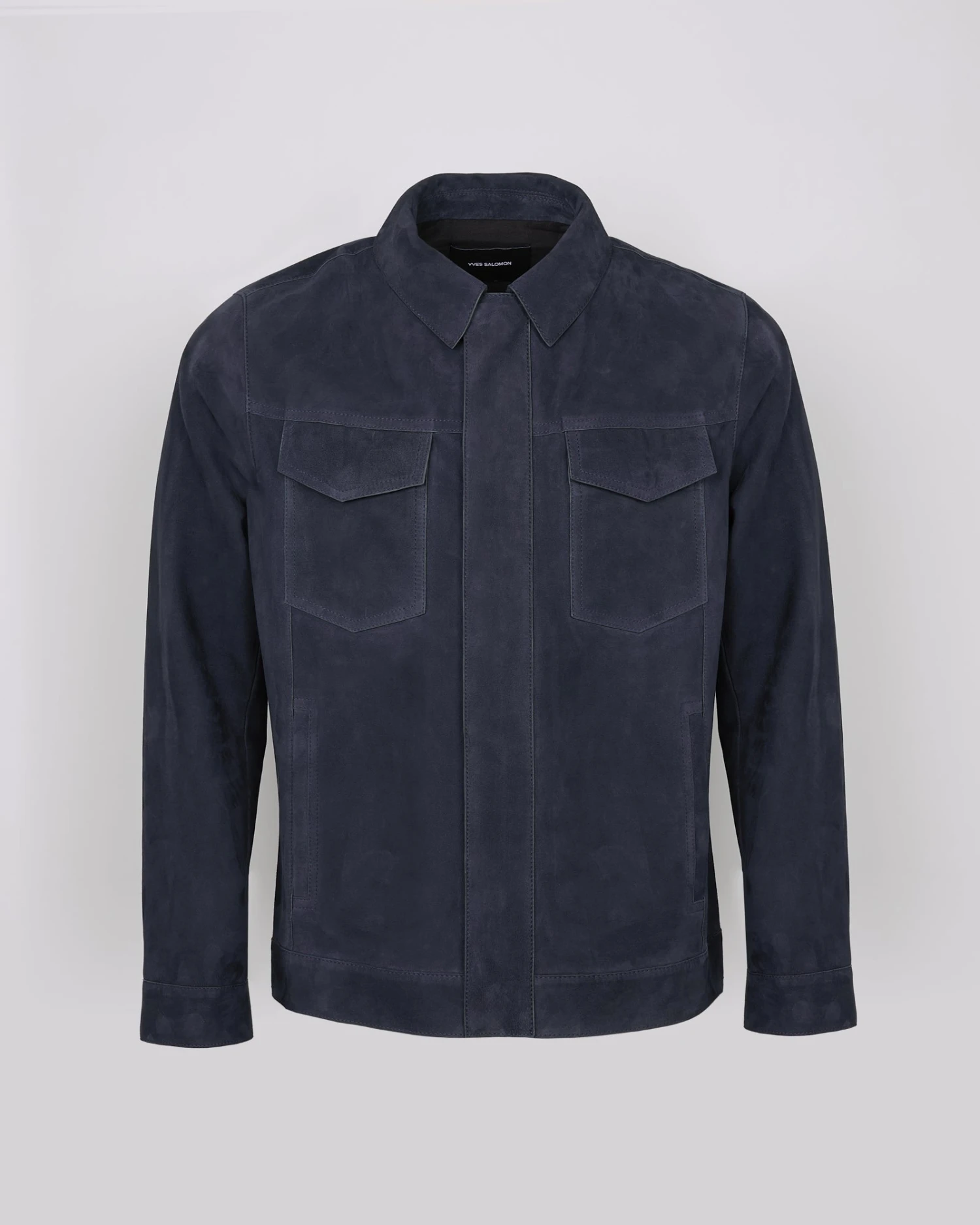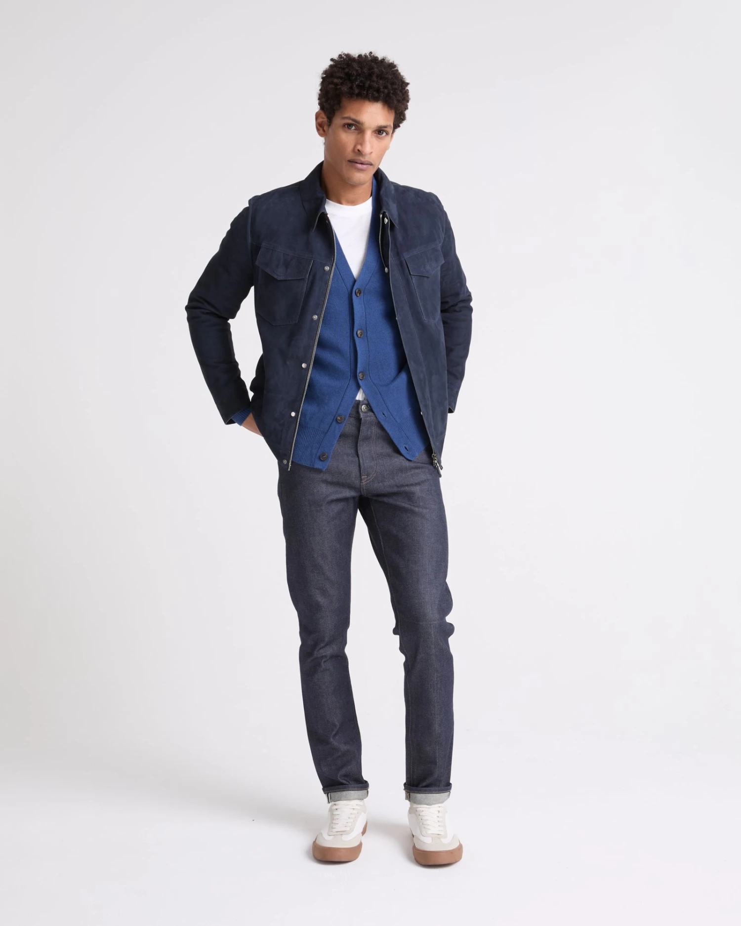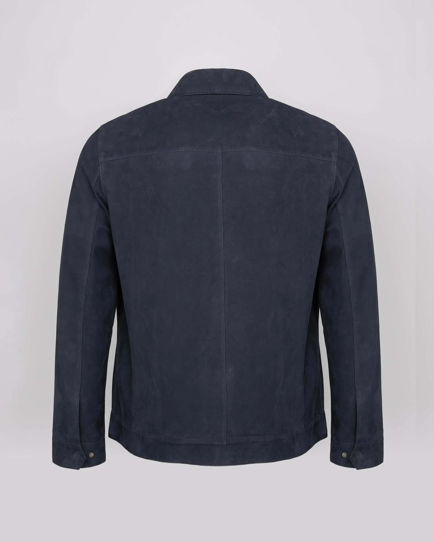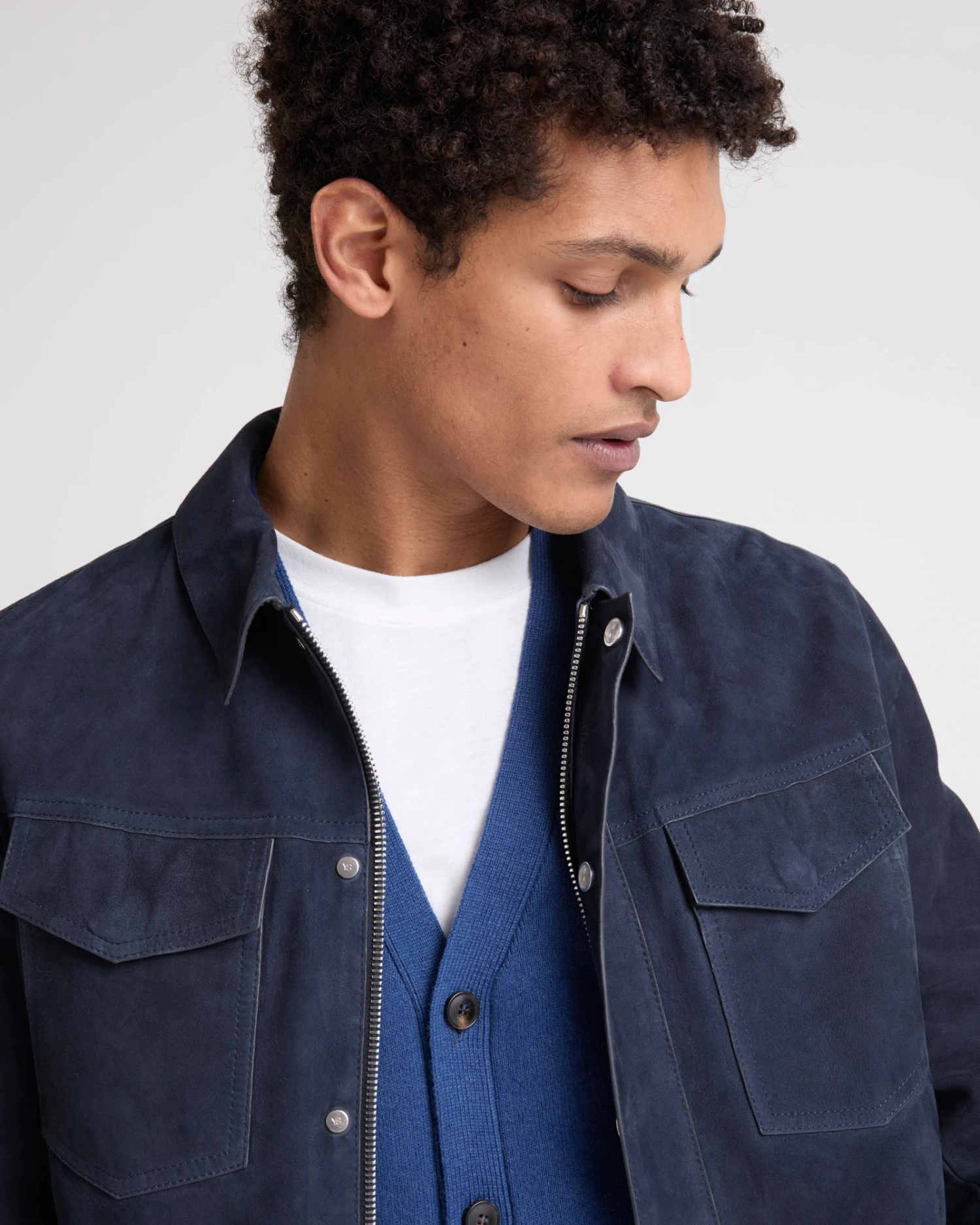 Une revisite contemporaine de la veste en jean en version cuir velours, avec l’incontournable col chemise. L’envers nappa du cuir apporte une main veloutée, avec des détails de bord finition maroquinerie. Deux poches poitrine et deux poches côté proposent symétrie et praticité. Fermeture zip sous patte pression.