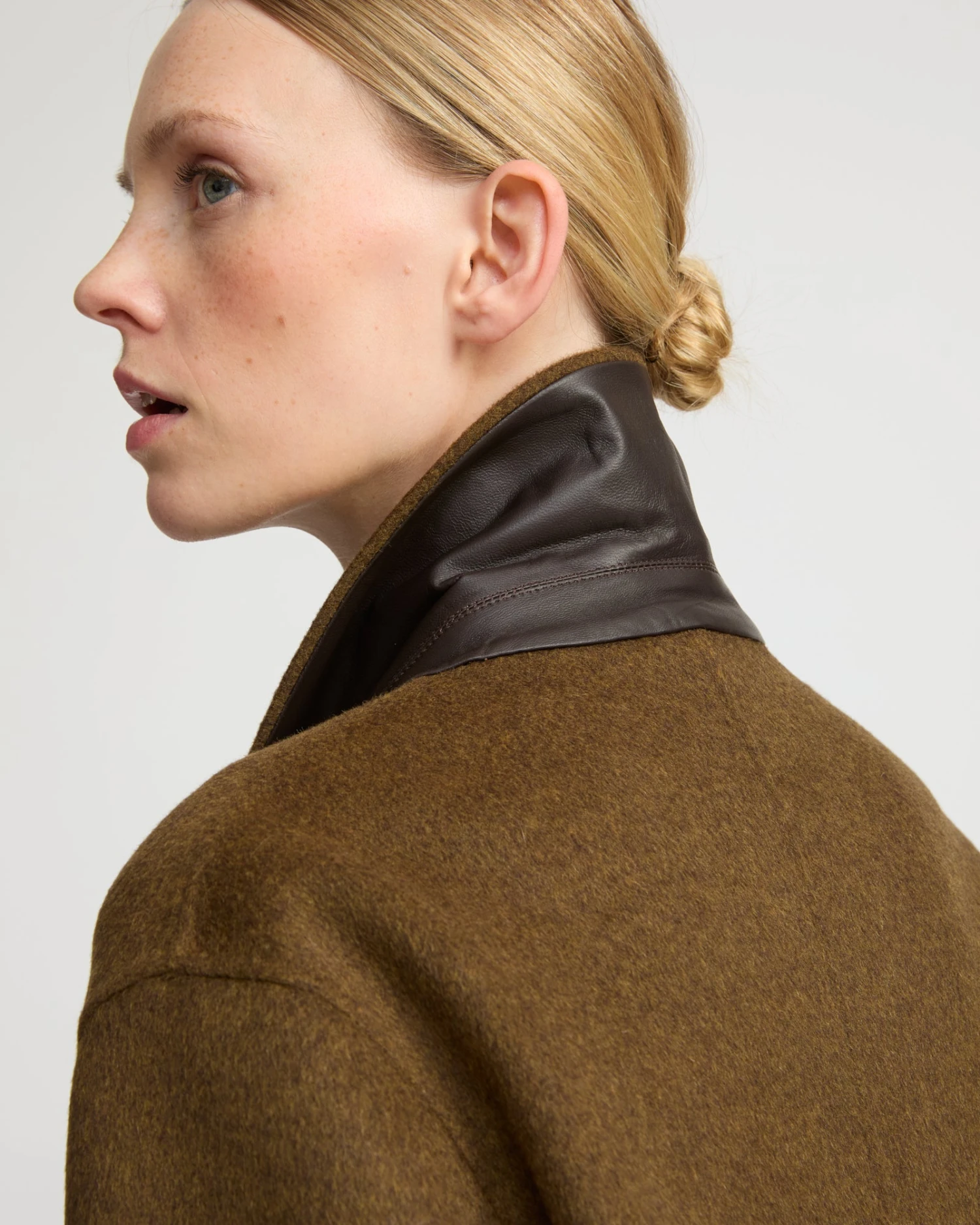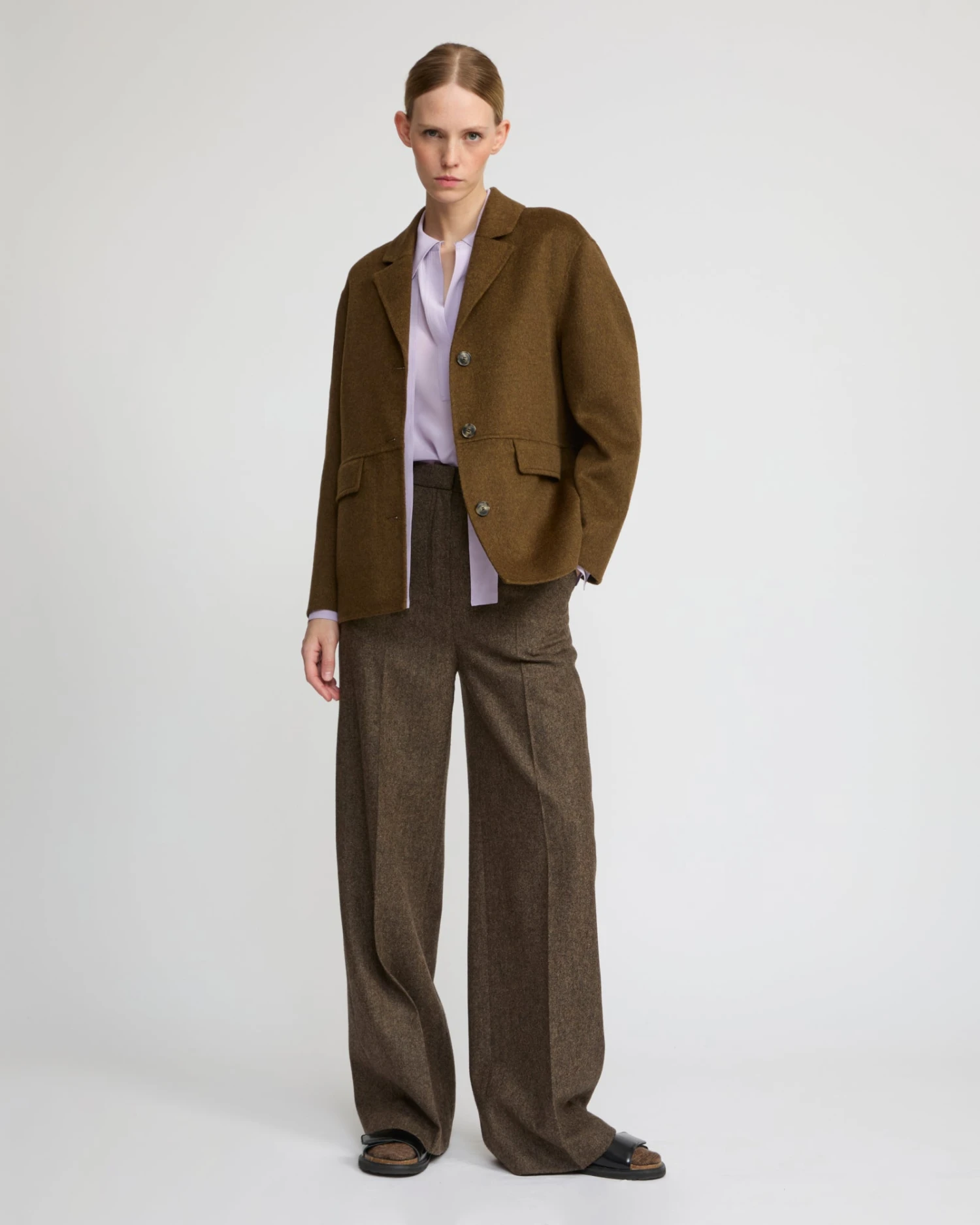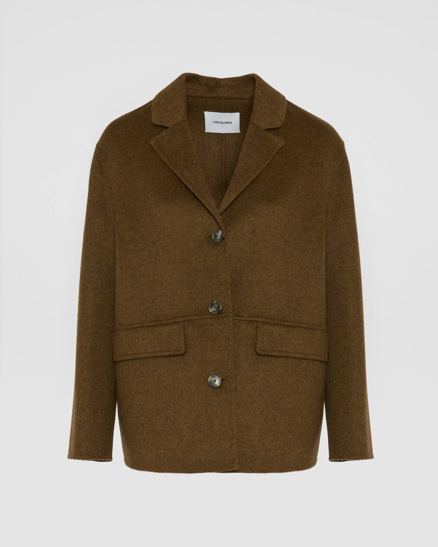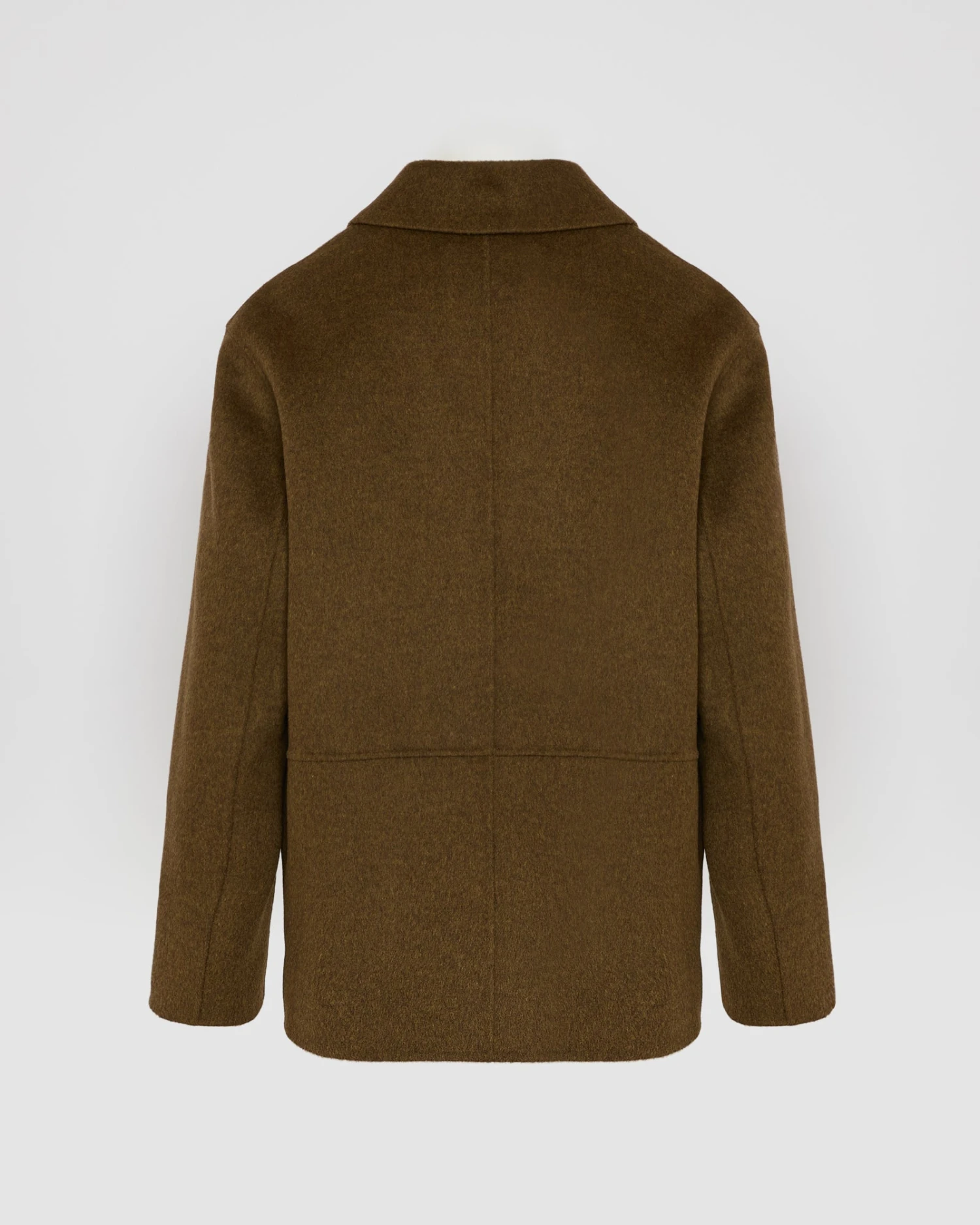Forme courte légèrement oversized et travail des coutures pour cette veste en laine et cachemire double-face, avec son petit col cranté, ses poches à rabats et sa fermeture par boutons façon corne.