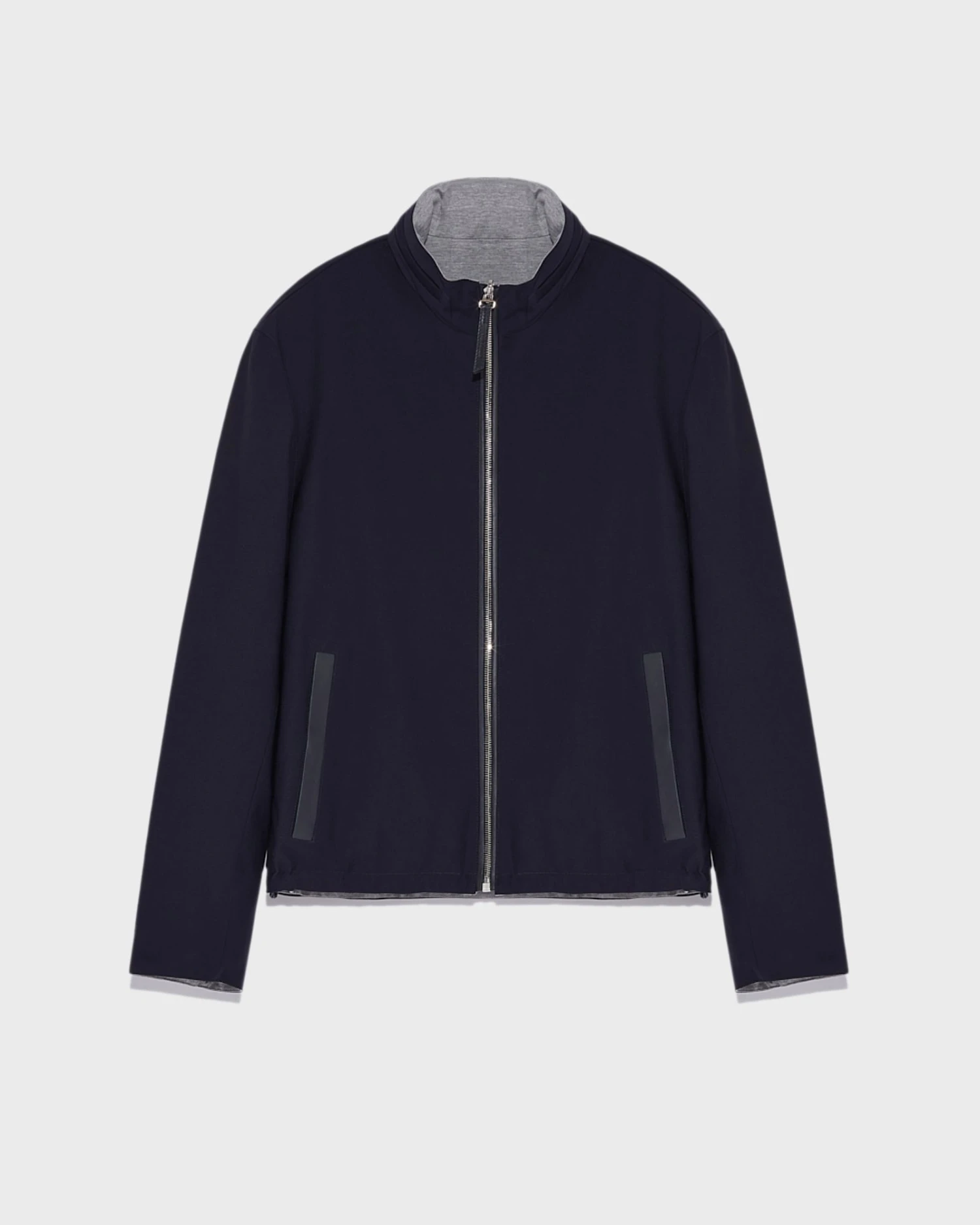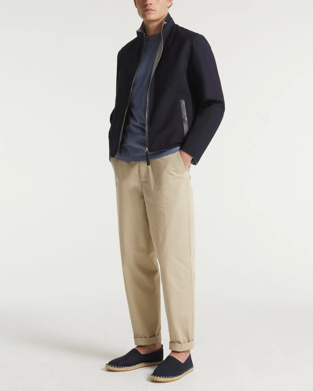 – Détails poches, patte col, tirette et lèvres de zip en cuir double-face