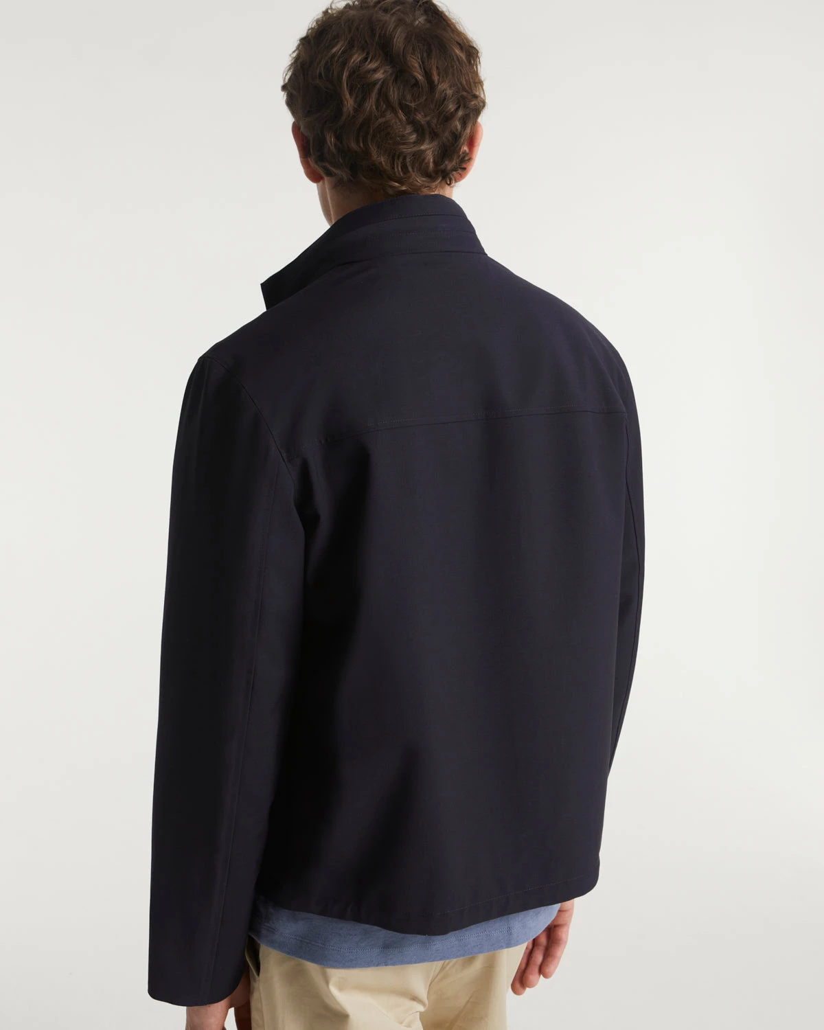 Cette petite veste en laine froide cache bien son jeu : sa face en laine technique résiste aux intempéries, avec une capuche secrète qui peut se glisser à l’intérieur du col une fois l’averse passée. L’envers du modèle est en jersey de coton doux pour un style plus décontracté. Sa coupe près du corps se ferme par zip et propose des détails en cuir aux poches et sur le col.