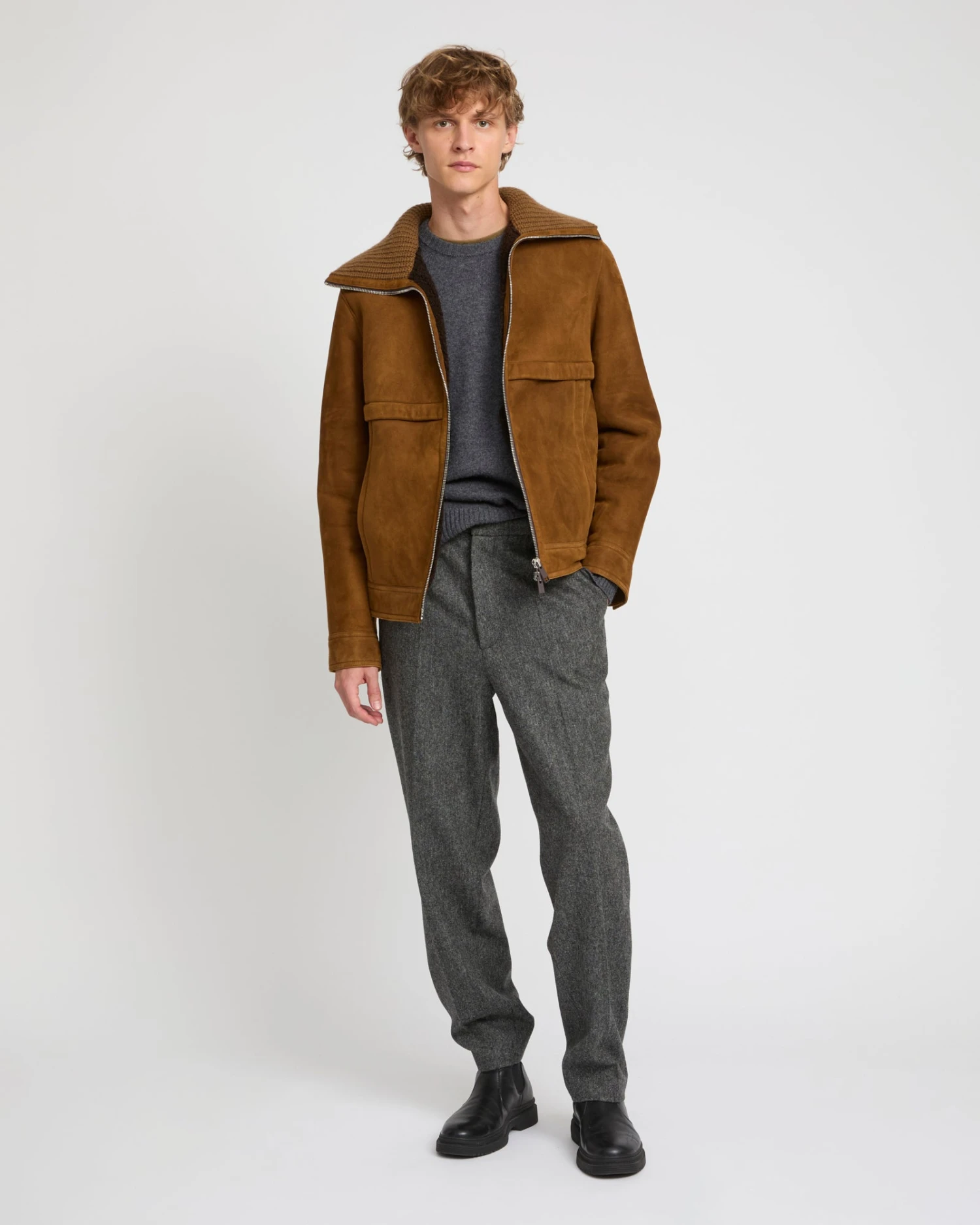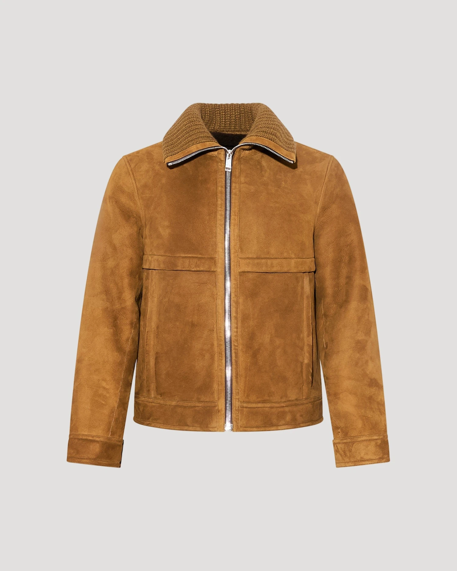 Une forme d’inspiration aviateur et une inspiration retro pour cette veste en peau lainée avec un large col en maille à côtes. Deux grandes poches basses à rabat, patch logo au dos.