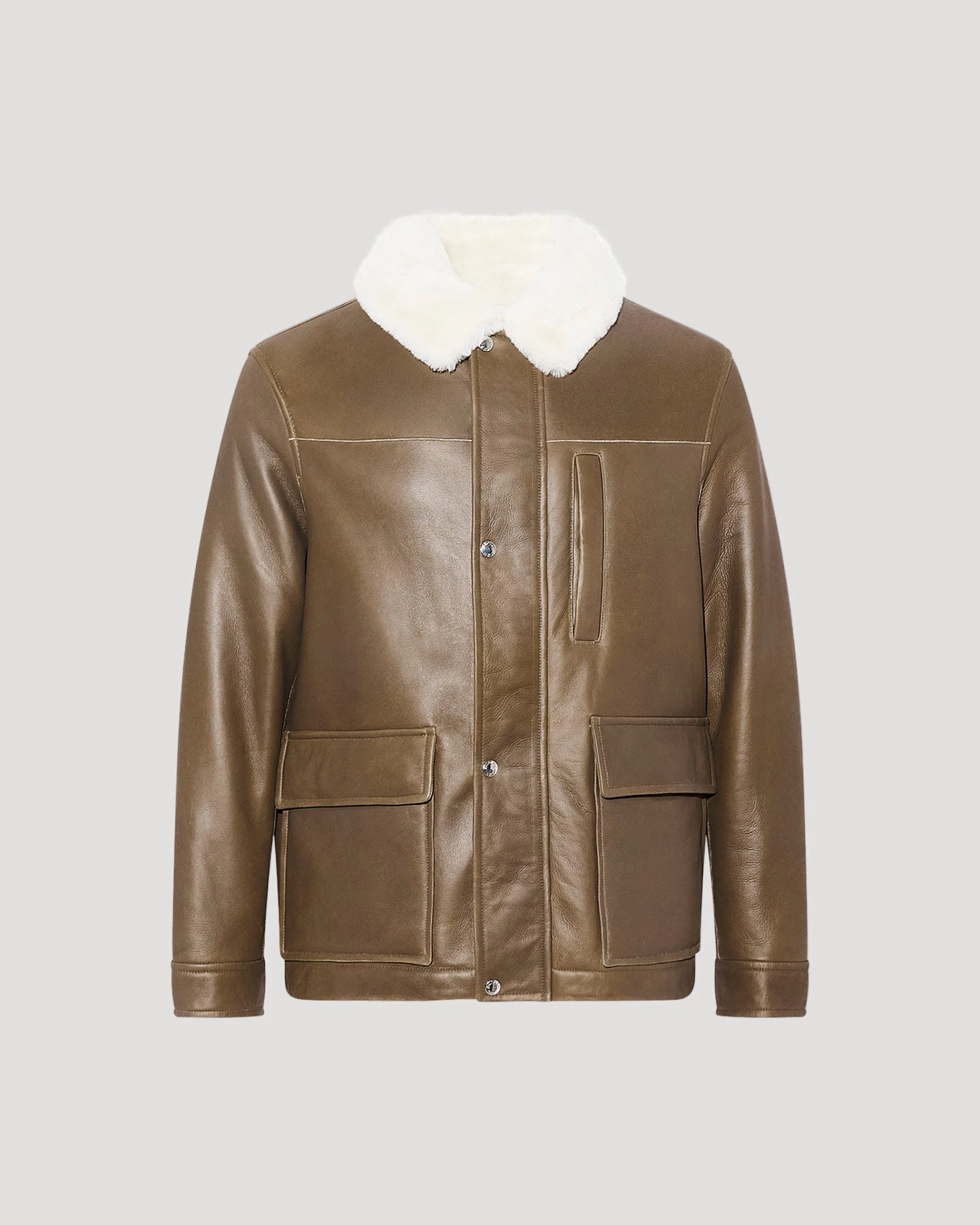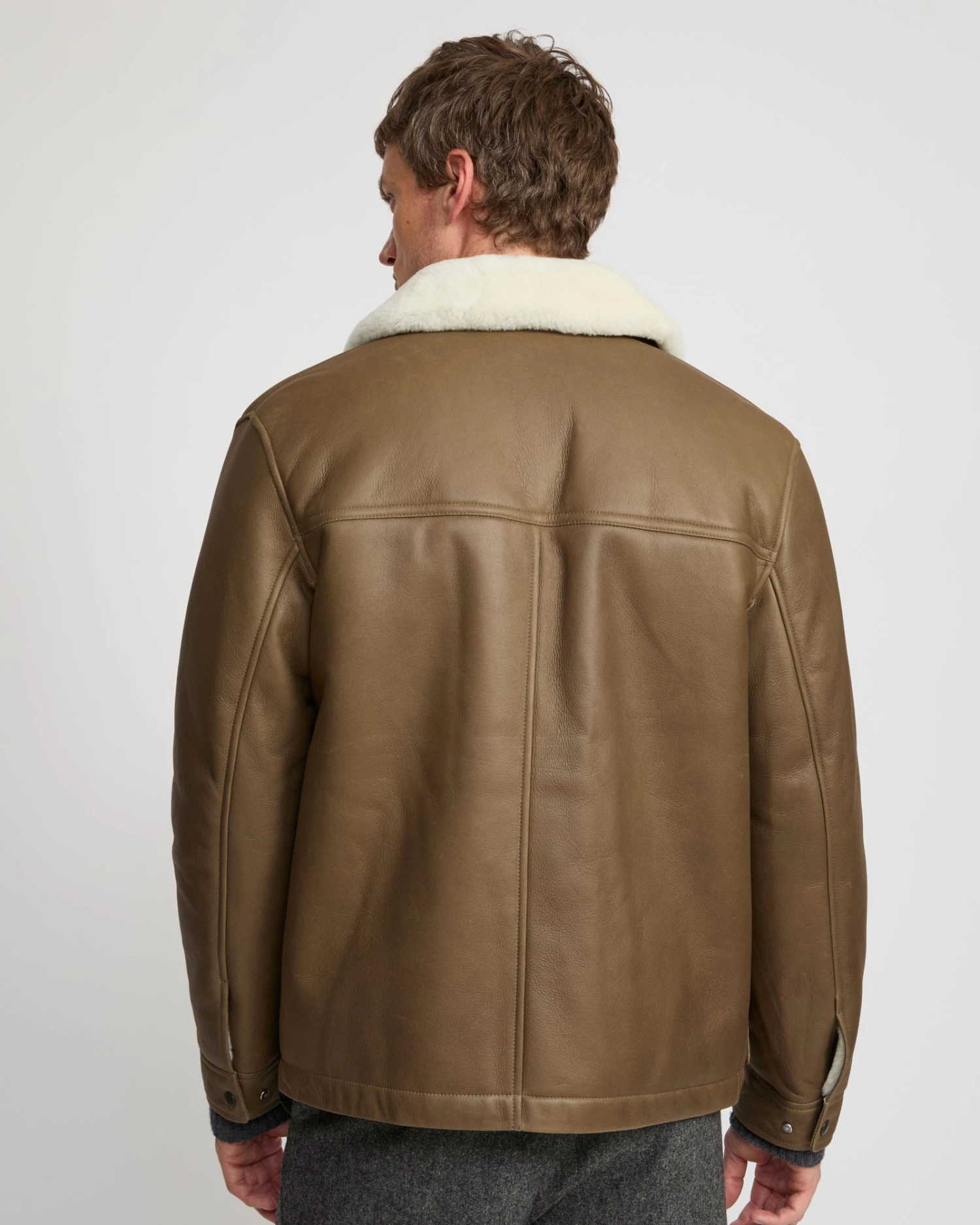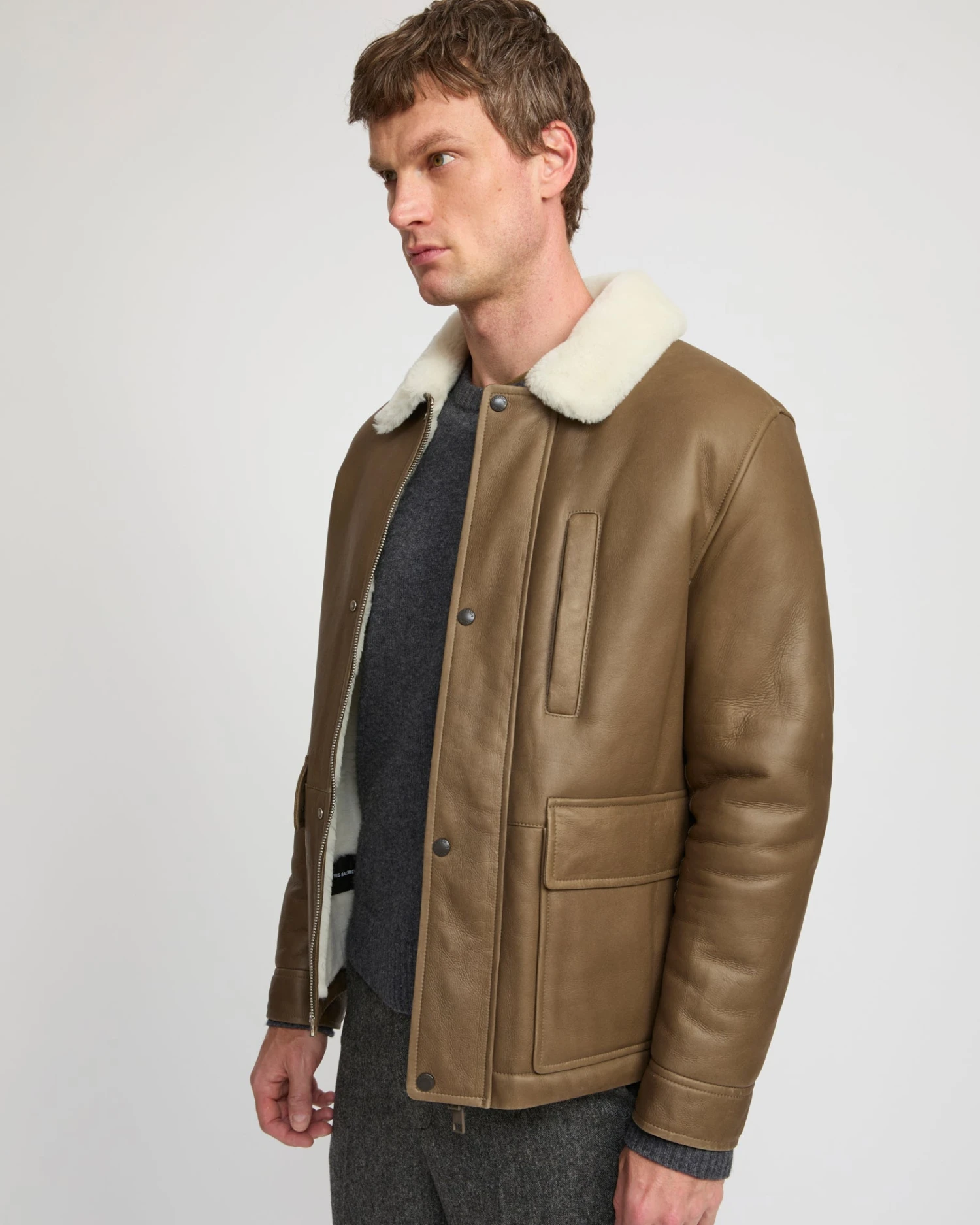 Une forme d’inspiration aviateur pour cette veste en peau lainée effet silky, dont la face laine se devine au col. Deux grandes poches basses et une poche poitrine à l’avant, poche siglée à l’intérieur, patch logo au dos.