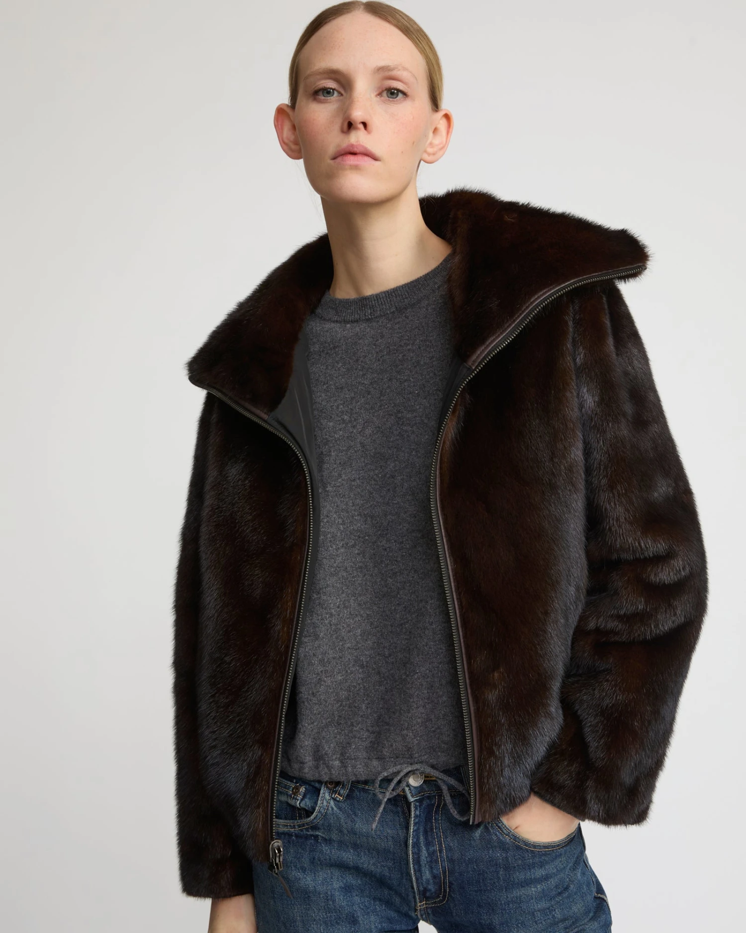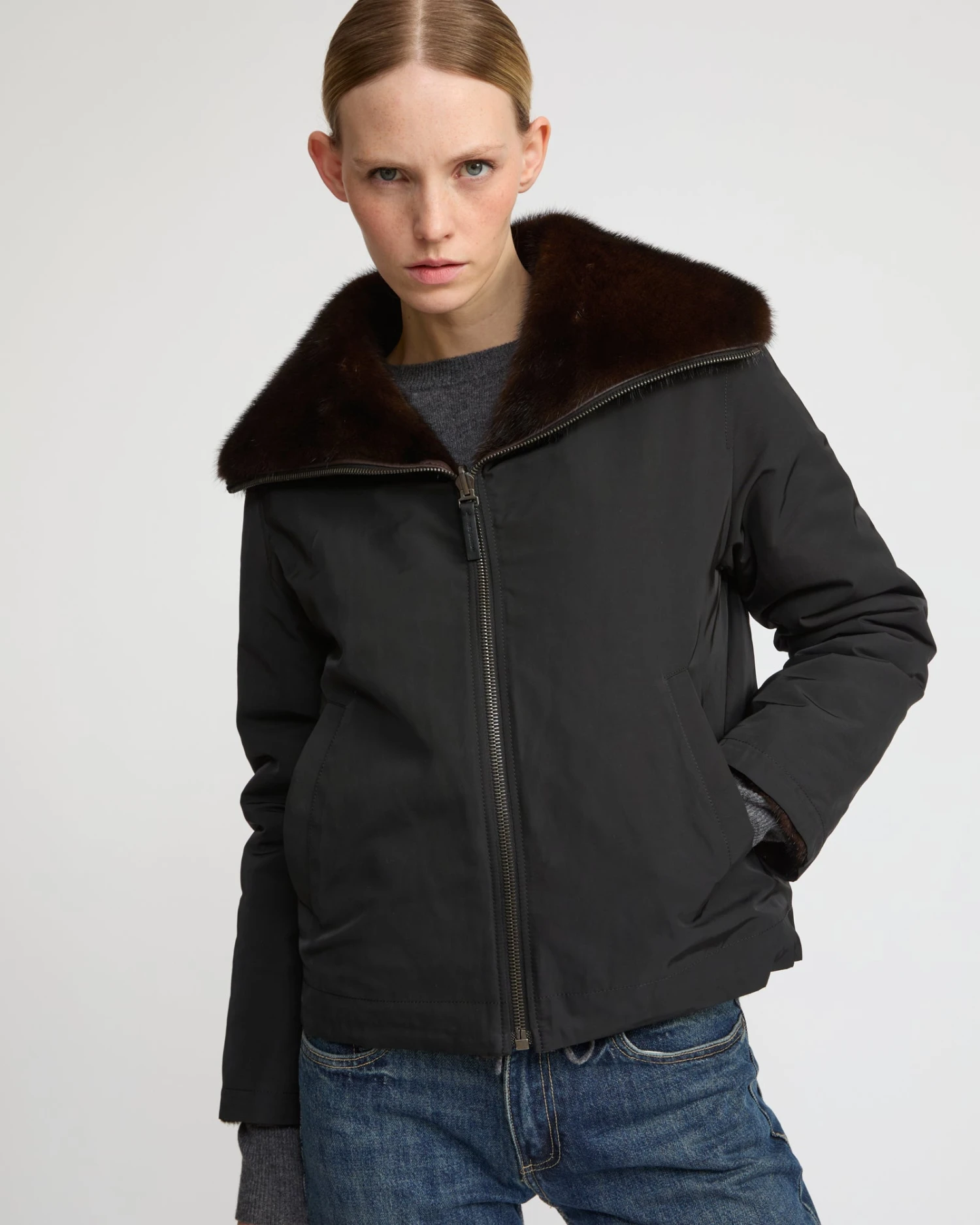 Les lignes sportives d’une petite veste zippée, travaillée dans une matière réversible, avec une face en tissu technique, et une face en fourrure de vison luxueuse et résistante. Ce modèle propose une isolation thermique testée jusqu’à -10°C.