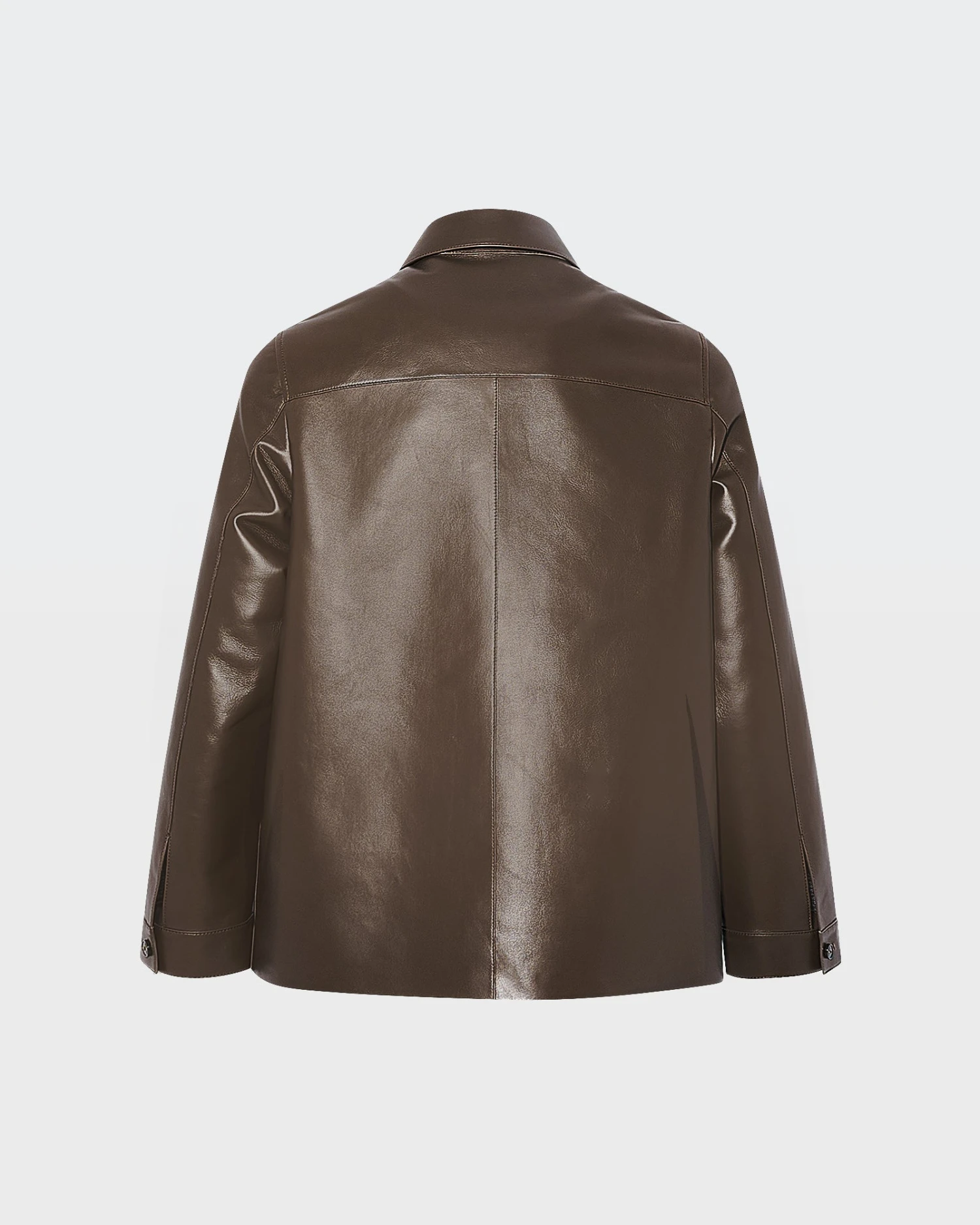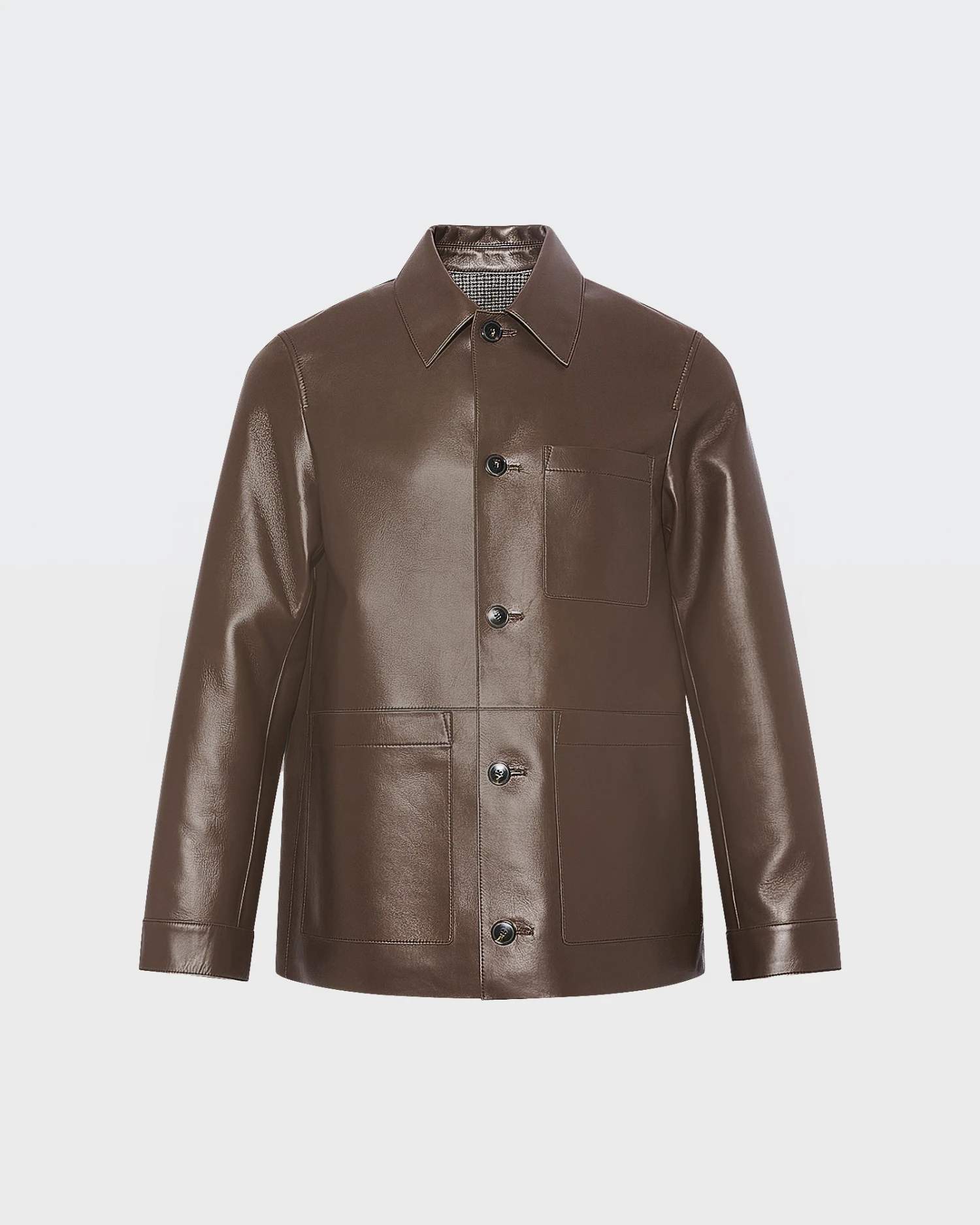 Une veste boutonnée, lignes épurées, qui joue les effets de texture avec sa matière double-face. L’extérieur en cuir d’agneau lisse et brillant est assemblé à un intérieur en flanelle motif pied-de-poule pour un tombé impeccable. Forme surchemise avec petit col.