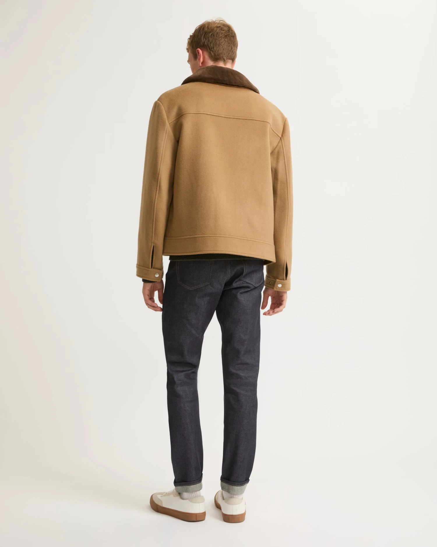 – Détails poches passepoilées, lèvres de protection zip, dessous de col en cuir